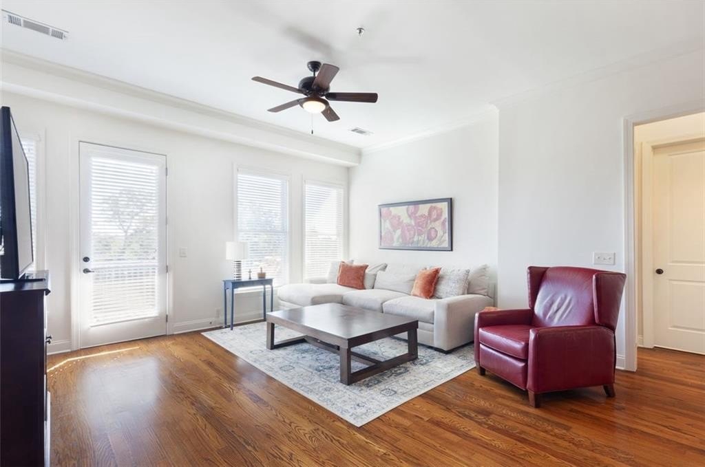 The living room exudes warmth and comfort, filled with natural light and designed for easy living. Step out onto your private balcony and enjoy a serene wooded view, where you can start your mornings with peaceful sunrises or unwind in the evening surrounded by nature’s calm — all within walking distance of the vibrant downtown scene.