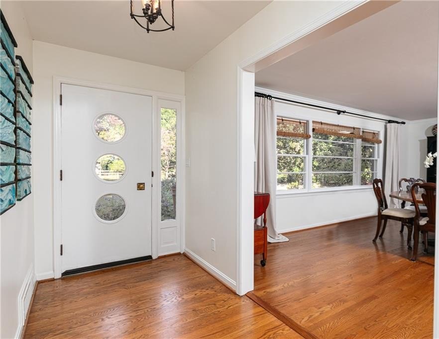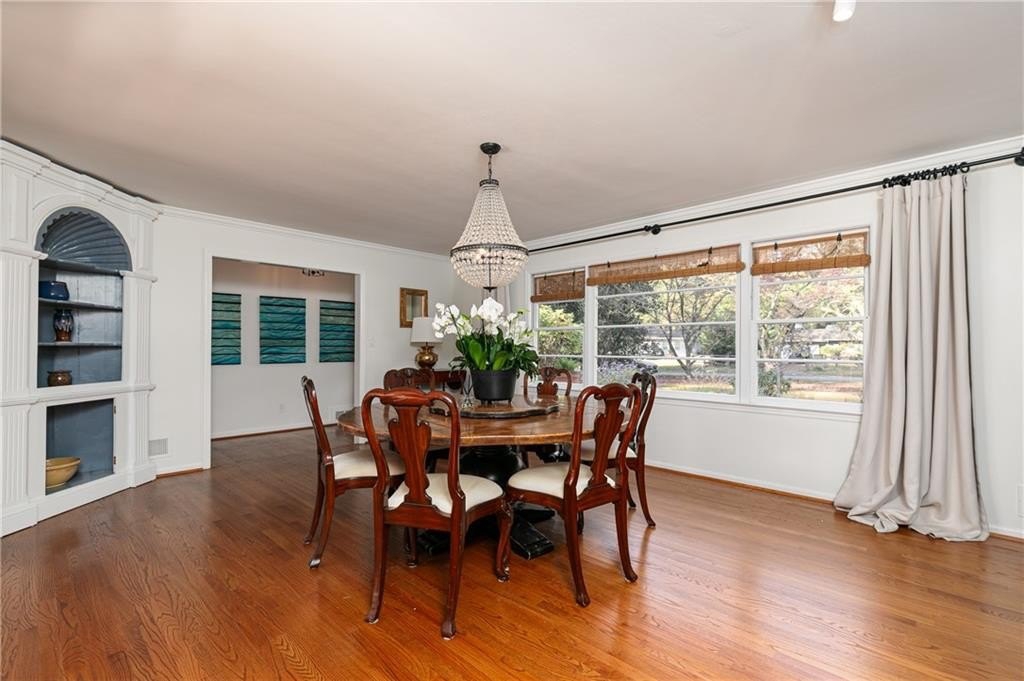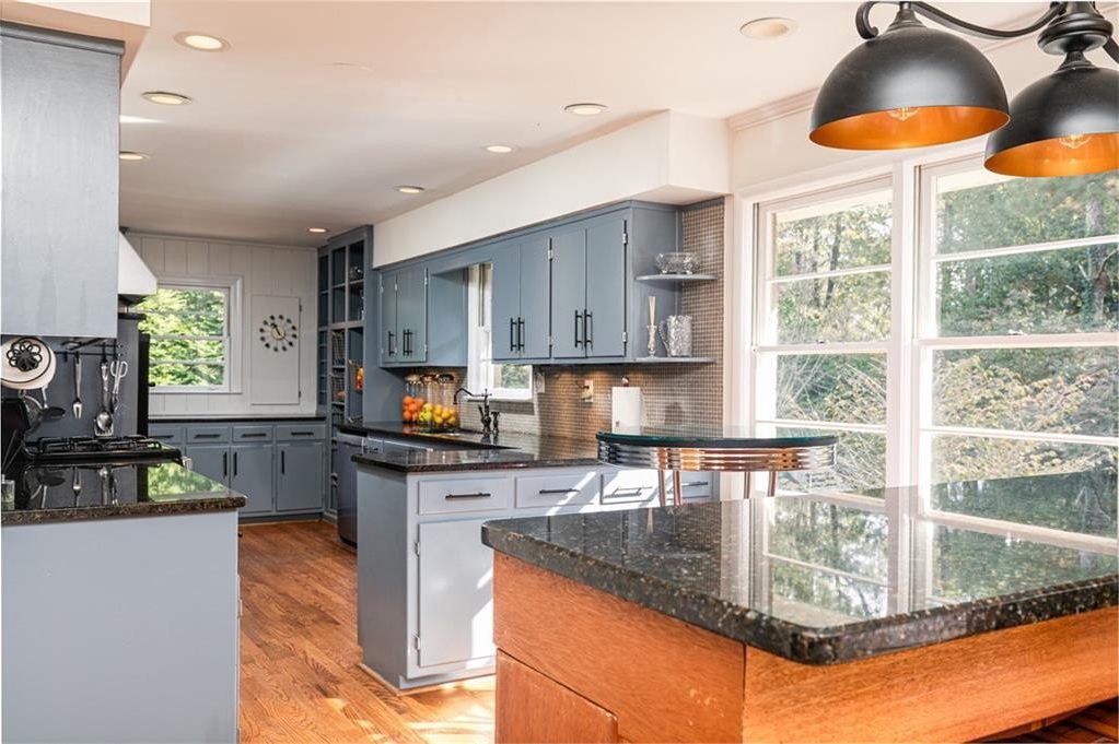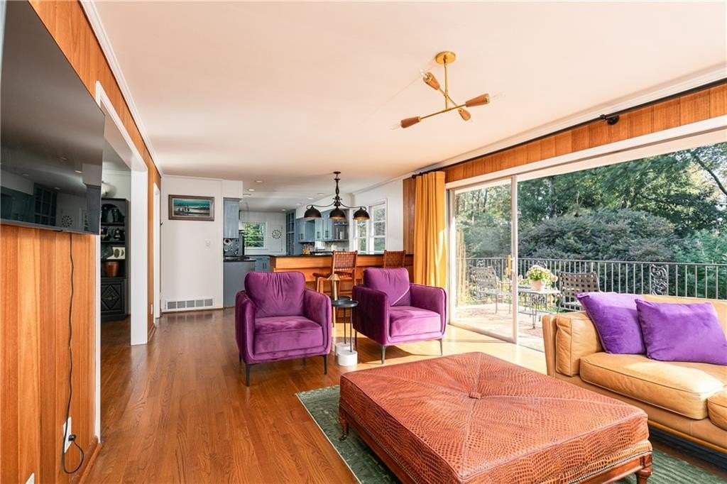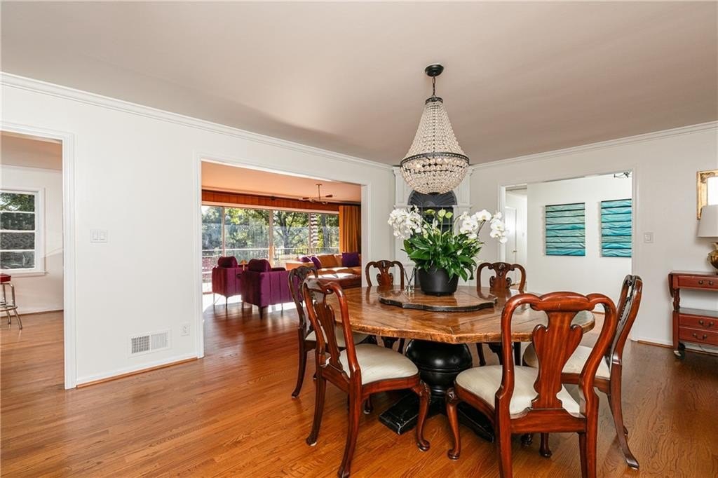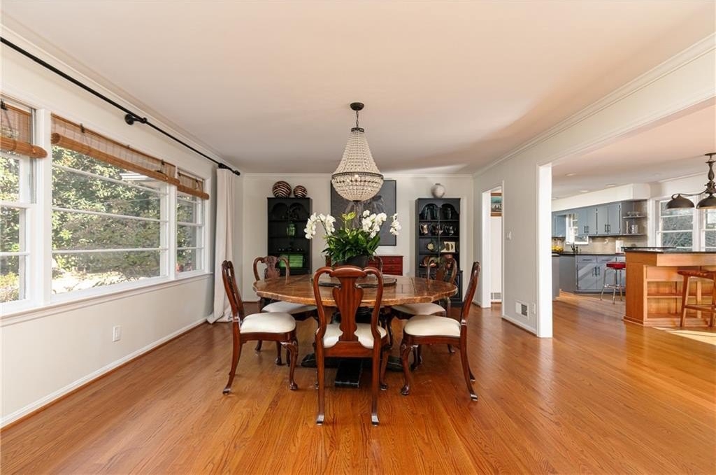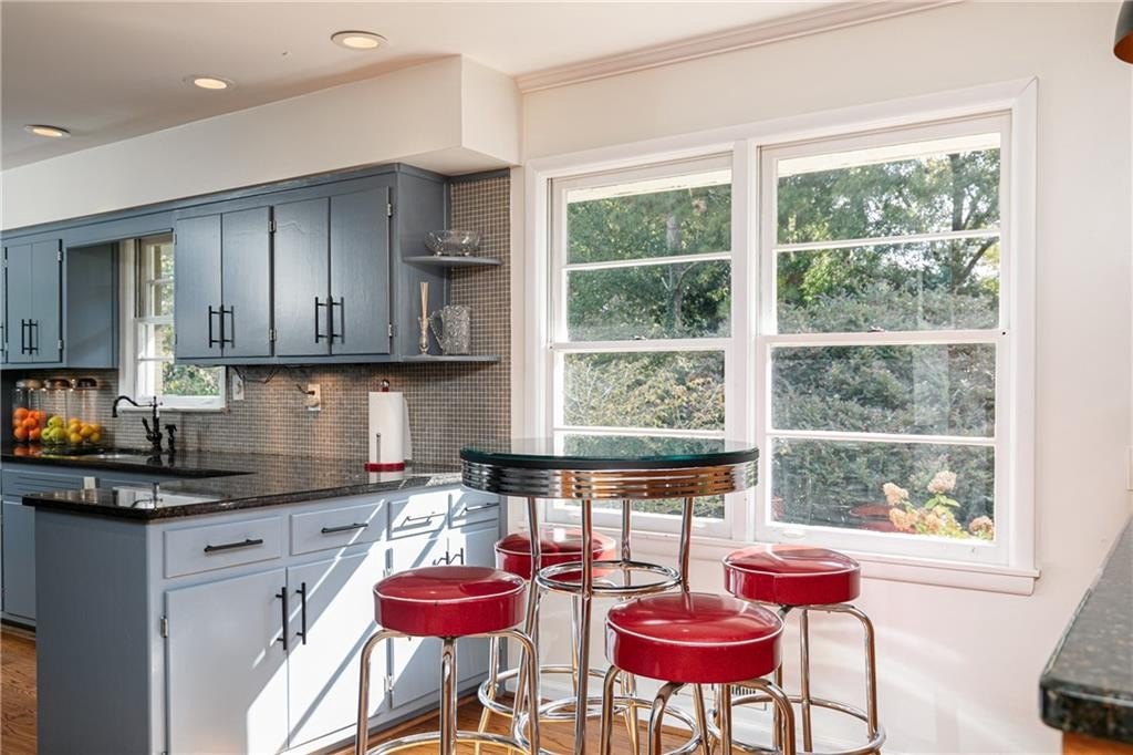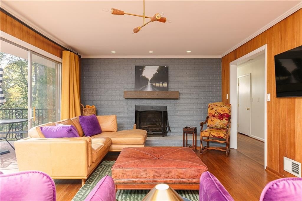 Discover the perfect blend of charm, comfort, and convenience in this beautifully maintained brick ranch, ideally positioned in the heart of Historic Roswell. Nestled among mature trees and lush landscaping, this home offers the rare opportunity to live within walking distance of the best that Roswell has to offer. Step inside to find a bright, open layout where natural light pours through large picture windows. The spacious dining room, kitchen, and family room flow seamlessly together, creating a relaxed, connected atmosphere perfect for everyday living and entertaining. The family room’s cozy brick fireplace and mantle pair perfectly with the home’s subtle mid-century touches, while hardwood floors run throughout much of the main level, adding timeless warmth. The eat-in kitchen features stone countertops, a gas range, and a charming view of the sitting area. Sliding glass doors open to a masonry balcony—ideal for morning coffee or evening gatherings overlooking the private backyard. The primary suite includes an ensuite bath with stone floors, a jacuzzi tub, and a shower combo.