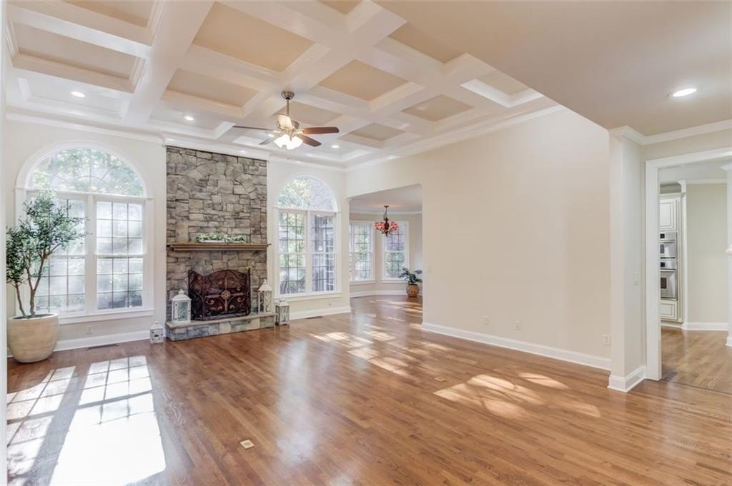 From the moment you enter, the brick herringbone design in the entryway and the grand front door set a tone of sophistication and quality. Step inside the impressive two-story foyer and experience a bright, open floor plan that flows seamlessly from the formal living and dining rooms into the spacious great room, featuring a coffered ceiling, beautiful stone fireplace, and large windows that fill the space with natural light—perfect for entertaining.
