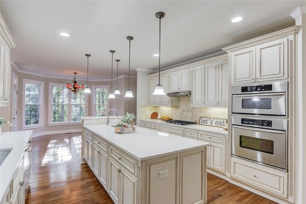 The gourmet kitchen shines with new stainless steel appliances, including a refrigerator and cooktop, a walk-in pantry, new quartz countertops, and a new garden sink with upgraded faucet. Thoughtful details like the built-in desk help organize daily mail, while the side entry from the driveway makes grocery drop-off effortless and convenient.