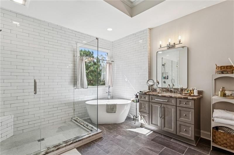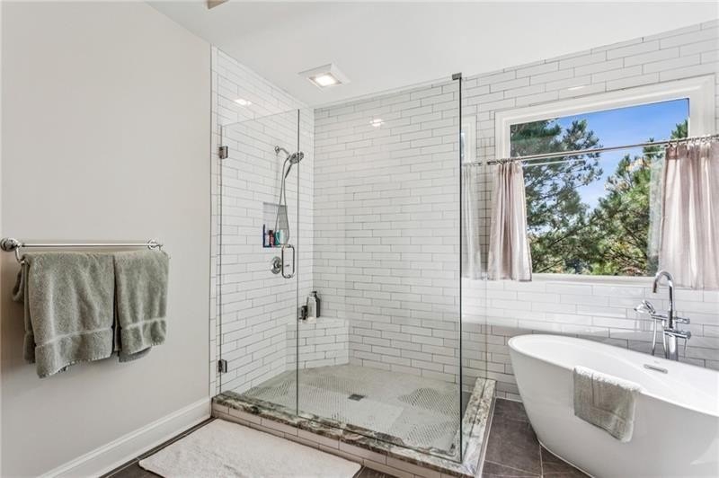 spa like bath features a soaking tub, oversized freshly tiled shower with frameless door and surround, separate