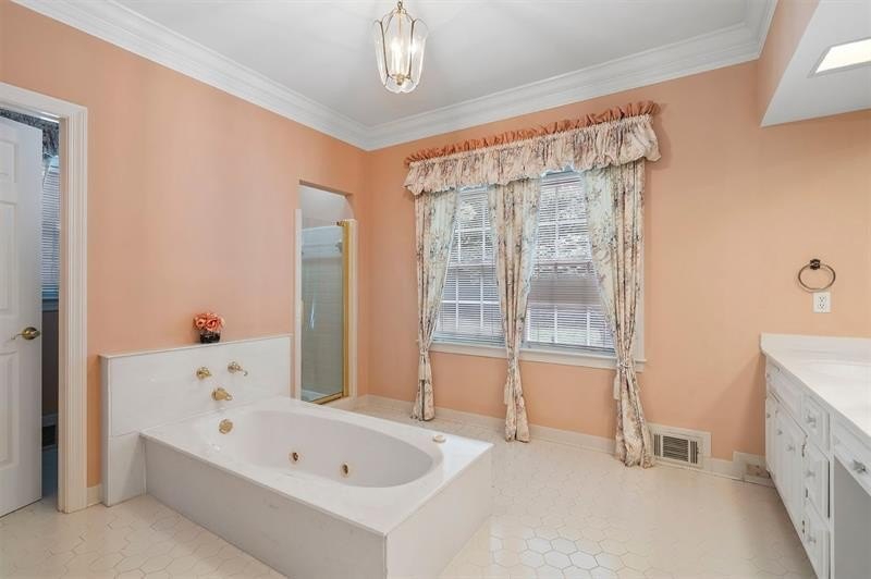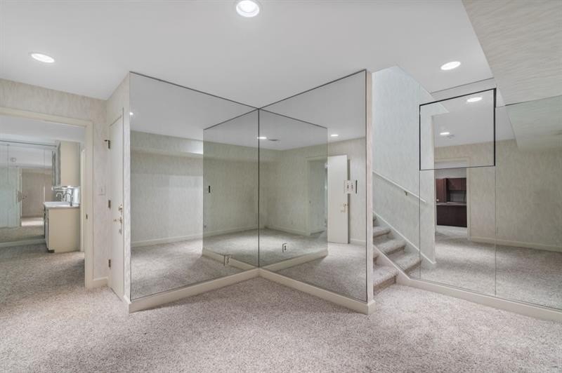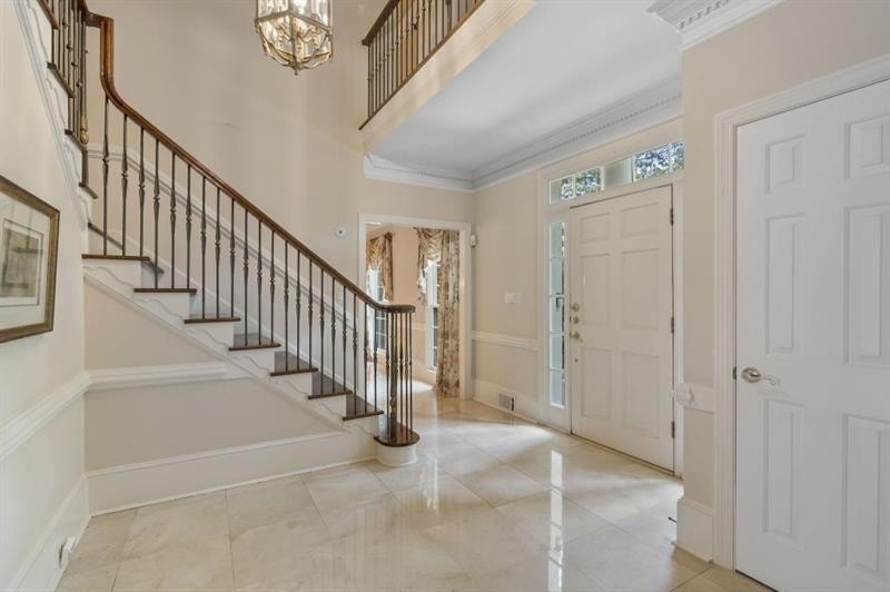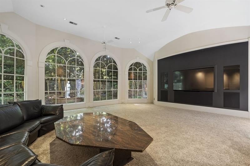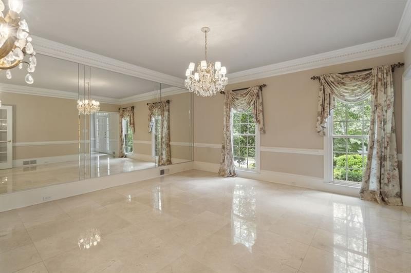 This elegant gated estate rests on 2.23 manicured acres in the heart of Sandy Springs, offering exceptional privacy, architectural sophistication, and an abundance of living space both inside and out. A long, landscaped driveway leads to a grand brick facade with classic columns. The grand double doors welcome you into a breathtaking two-story foyer featuring polished marble floors and a sweeping staircase. To the left, the formal living room invites conversation with its fireplace and abundant natural light, while across the foyer the formal dining room exudes elegance with marble flooring and a mirrored feature wall. The richly paneled den, accented by coffered ceilings and a fireplace, offers a warm and refined space for quiet reading or intimate gatherings. Nearby, a solarium with floor-to-ceiling windows and an antique fountain opens into an expansive media and entertainment room, complete with built-in cabinetry, a retractable awning, surround sound, and dramatic Palladian-style windows that flood the space with light. The heart of the home lies in the gourmet kitchen, with white custom cabinetry, porcelain tile flooring, stainless steel appliances including a built-in steamer, tile backsplash, and off-white Corian countertops. A spacious breakfast room and adjacent sunroom provide stunning views of the backyard, creating a peaceful setting for daily living. The main level also features a large primary suite with dual oversized closets and a private en suite bath, ideal for guests. Upstairs, the luxurious secondary primary suite is a true retreat, highlighted by a lighted double tray ceiling, spa-inspired bath with dual vanities, a jacuzzi tub, and a custom-designed oversized closet. Additional upstairs bedrooms are generously sized and share well-appointed baths, offering comfort and privacy for family and guests. The finished terrace level expands the home's living space with a versatile layout that includes a home office, a full bath, a wet bar, a game area, and direct access to a covered patio. Just off the terrace level, there's ample space to add a custom pool, allowing seamless indoor-outdoor entertaining. On the opposite side of the storage building, there's room for a tennis court or handball court, adding even more recreational possibilities to the estate. Several levels throughout the home and grounds can comfortably host mixed indoor-outdoor gatherings of over 100 people, making it ideal for entertaining on a grand scale. The grounds are equally impressive, featuring brick paver pathways, manicured lawns, classical statues, multiple fountains, and a built-in gas grill-perfect for al fresco entertaining. The guest house features its own three-car garage, providing private accommodations that include a living space with a kitchen, a full bathroom, and a bedroom. This arrangement increases the total garage capacity to five cars. This one-of-a-kind estate offers timeless craftsmanship, thoughtful updates, and premier amenities in one of Sandy Springs' most sought-after neighborhoods.