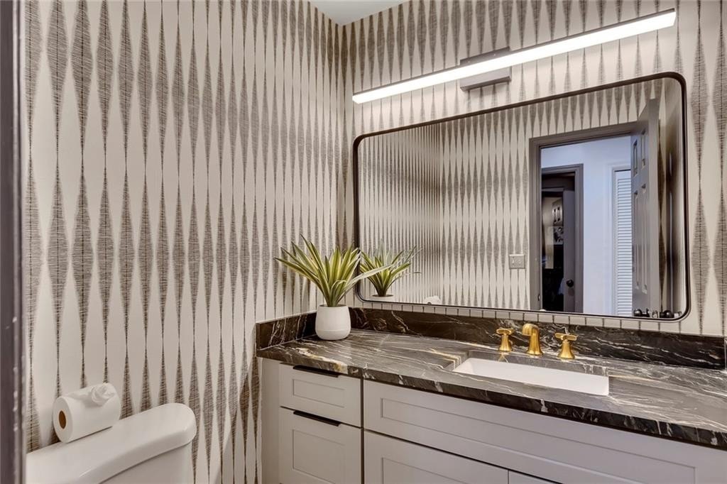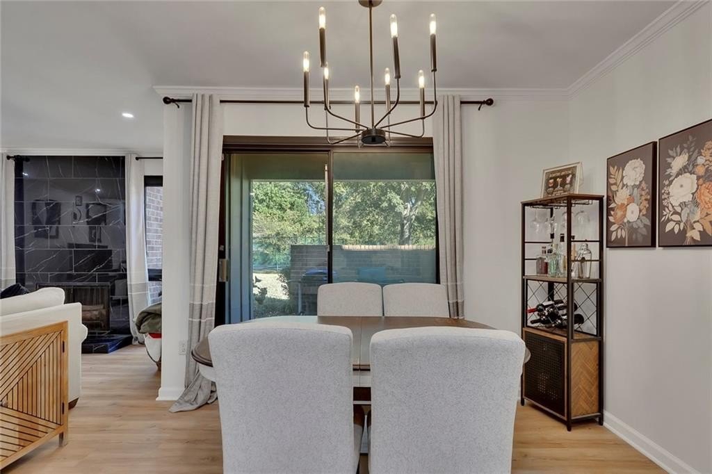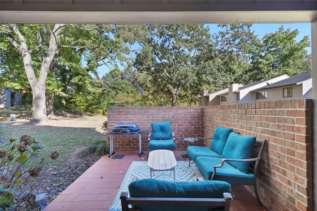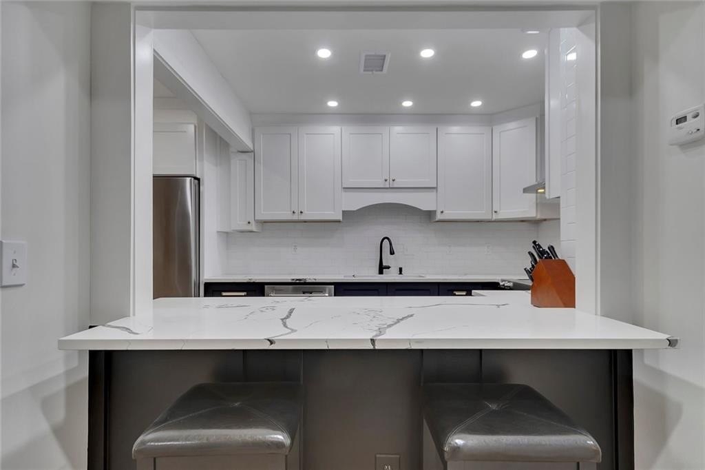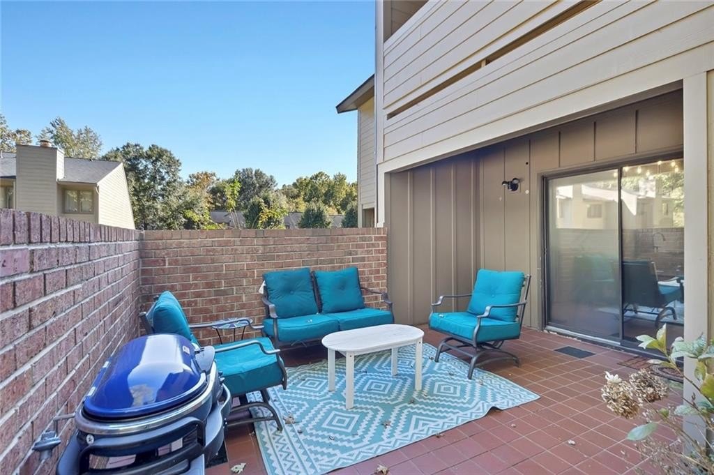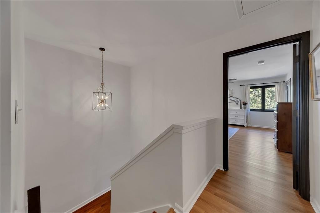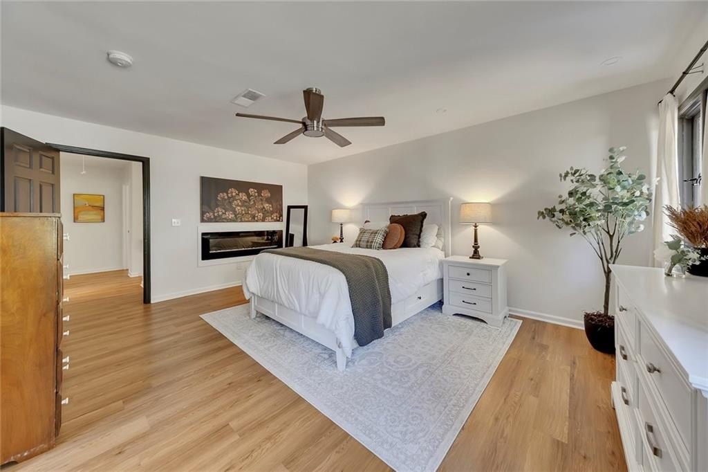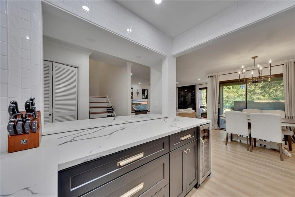 Beautifully renovated home nestled in Marietta. This stunning East Cobb residence is ideally located just minutes from Truist Park (home of the Atlanta Braves) and The Battery with its array of shops, restaurants, and entertainment options. Enjoy easy access to I-75, I-285, Chattahoochee Park, and walking trails, as well as nearby shopping and dining. Step inside to discover a thoughtfully designed interior showcasing a host of curated upgrades. A private office with glass door, custom trim, and designer lighting provides an ideal workspace right off the entry. The chef’s kitchen is a true showstopper, featuring new soft-close cabinetry, a touch faucet, motion-sensor under-cabinet lighting, recessed lighting, and premium KitchenAid Professional appliances. A beverage refrigerator and designer quartz countertops with a waterfall edge complete this stunning culinary space. The open-concept family room is both elegant and functional, featuring a custom-built-in bookcase, redesigned fireplace surround, and recessed lighting. It flows seamlessly into the dining area—perfect for entertaining. Step outside to your patio overlooking peaceful green space, ideal for relaxing or dining al fresco. A stylish half bath on the main level includes new cabinetry, flooring, lighting, and statement wallpaper. Upstairs, the light-filled primary suite offers a cozy fireplace, private balcony, and a luxurious ensuite bath with a custom shower, double vanity, and LED mirror. Two additional spacious bedrooms share an updated full bath, with a conveniently located laundry area between them.