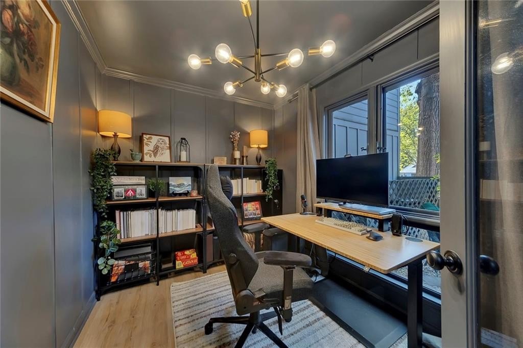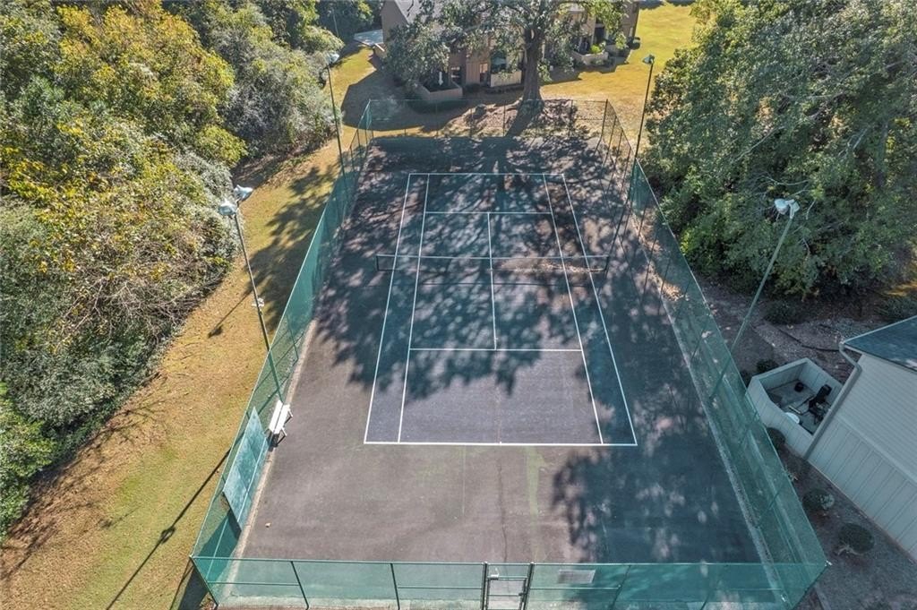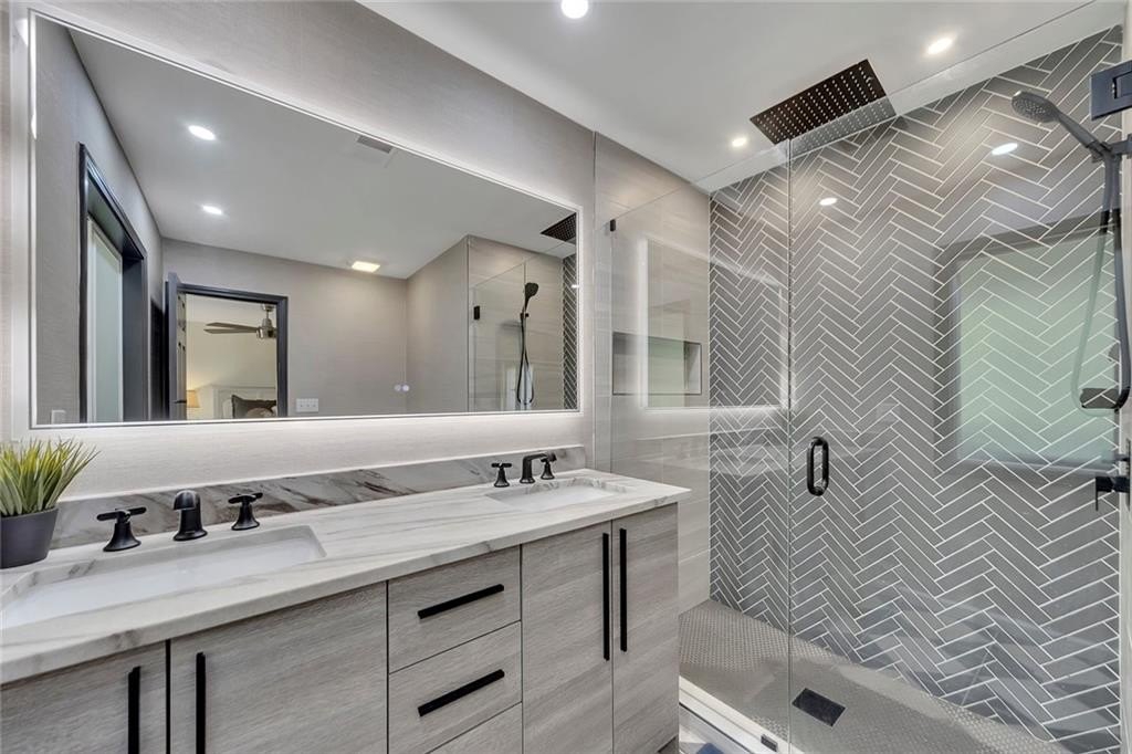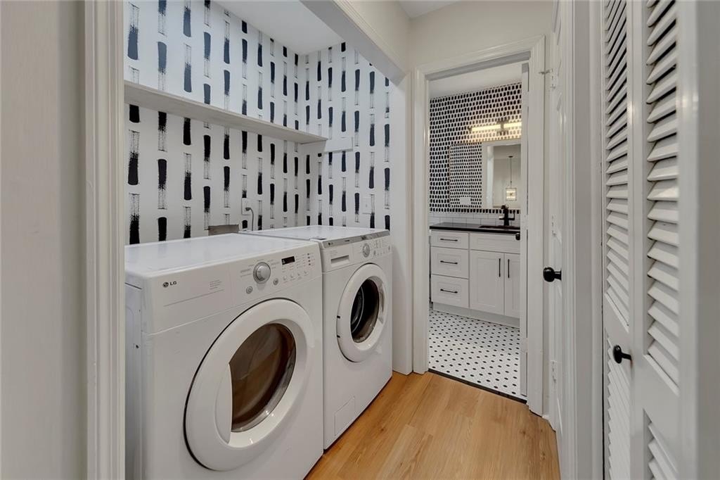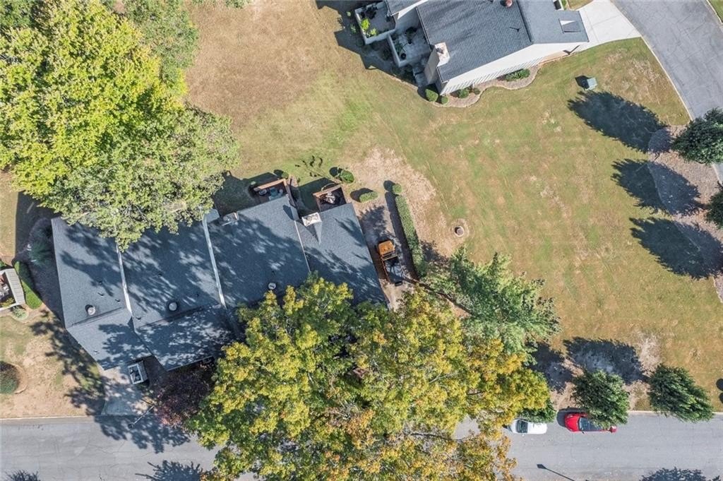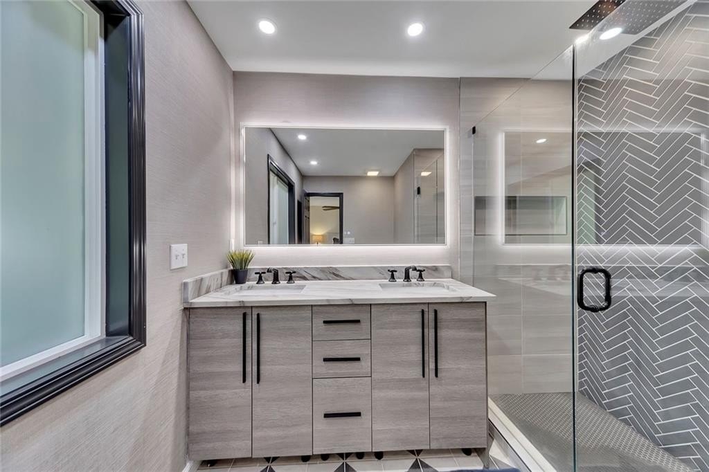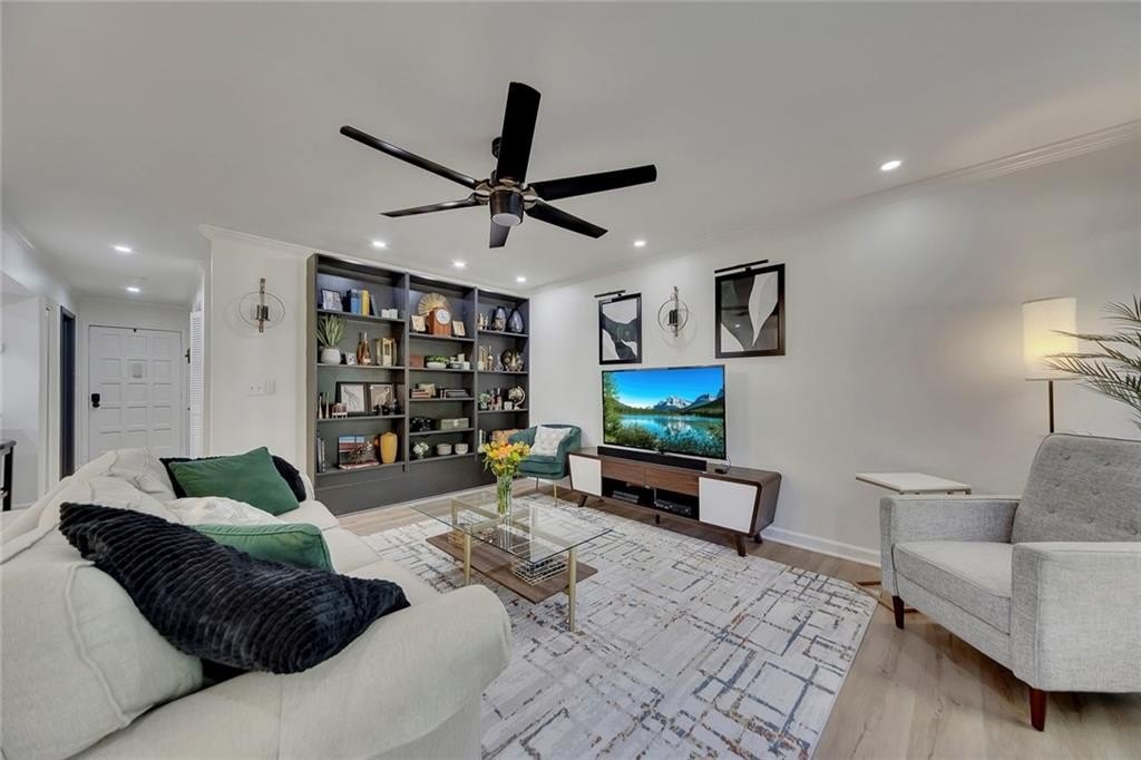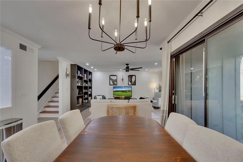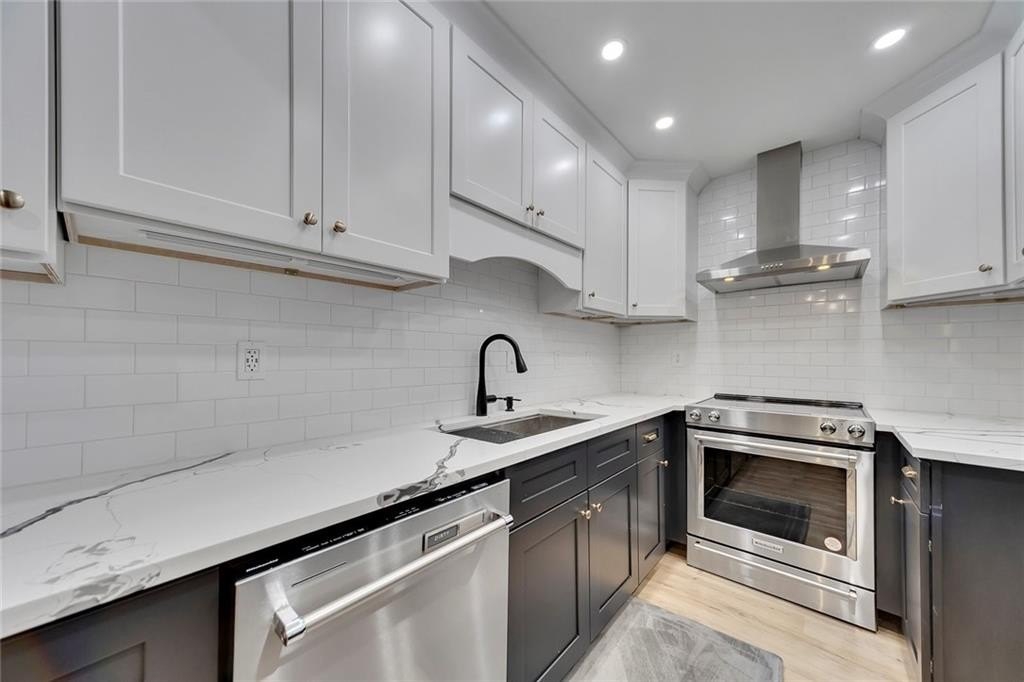Beautifully renovated home nestled in Marietta. This stunning East Cobb residence is ideally located just minutes from Truist Park (home of the Atlanta Braves) and The Battery with its array of shops, restaurants, and entertainment options. Enjoy easy access to I-75, I-285, Chattahoochee Park, and walking trails, as well as nearby shopping and dining. Step inside to discover a thoughtfully designed interior showcasing a host of curated upgrades. A private office with glass door, custom trim, and designer lighting provides an ideal workspace right off the entry. The chef’s kitchen is a true showstopper, featuring new soft-close cabinetry, a touch faucet, motion-sensor under-cabinet lighting, recessed lighting, and premium KitchenAid Professional appliances. A beverage refrigerator and designer quartz countertops with a waterfall edge complete this stunning culinary space. The open-concept family room is both elegant and functional, featuring a custom-built-in bookcase, redesigned fireplace surround, and recessed lighting. It flows seamlessly into the dining area—perfect for entertaining. Step outside to your patio overlooking peaceful green space, ideal for relaxing or dining al fresco. A stylish half bath on the main level includes new cabinetry, flooring, lighting, and statement wallpaper. Upstairs, the light-filled primary suite offers a cozy fireplace, private balcony, and a luxurious ensuite bath with a custom shower, double vanity, and LED mirror. Two additional spacious bedrooms share an updated full bath, with a conveniently located laundry area between them.