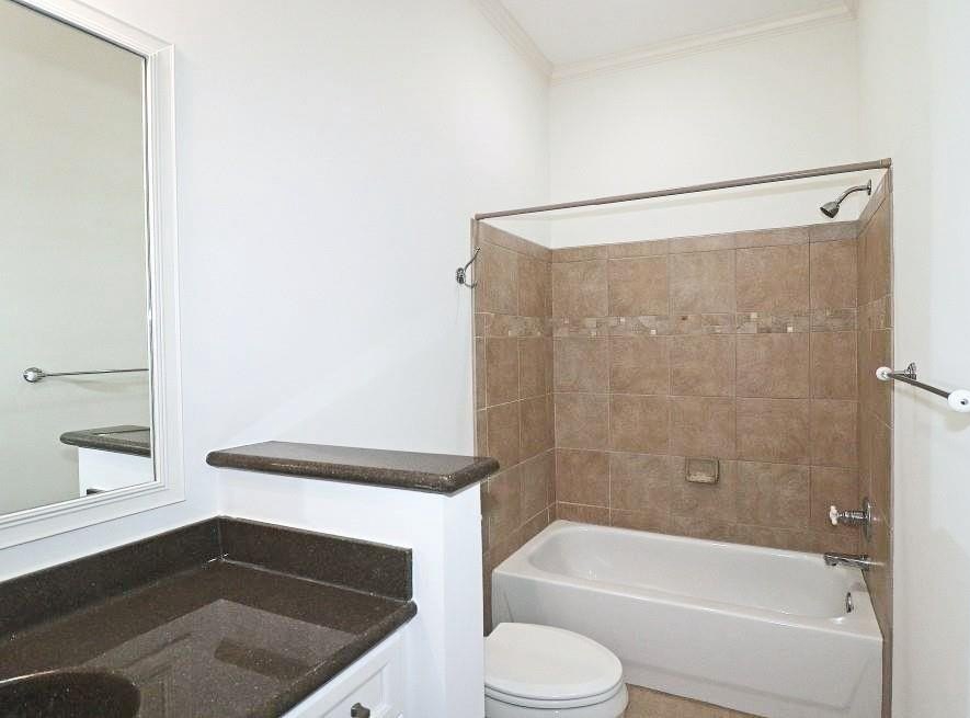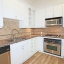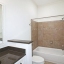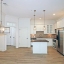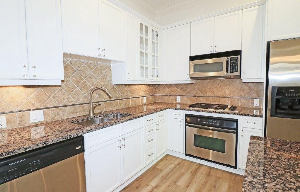 floors in the living area, carpet in bedrooms. Kitchen features white cabinets, stainless steel appliances and granite countertops. The amenities include a