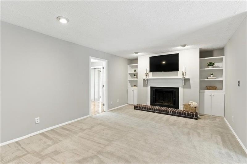 floor plan with a cozy fireplace framed by built-in shelving, perfect for relaxing or entertaining.