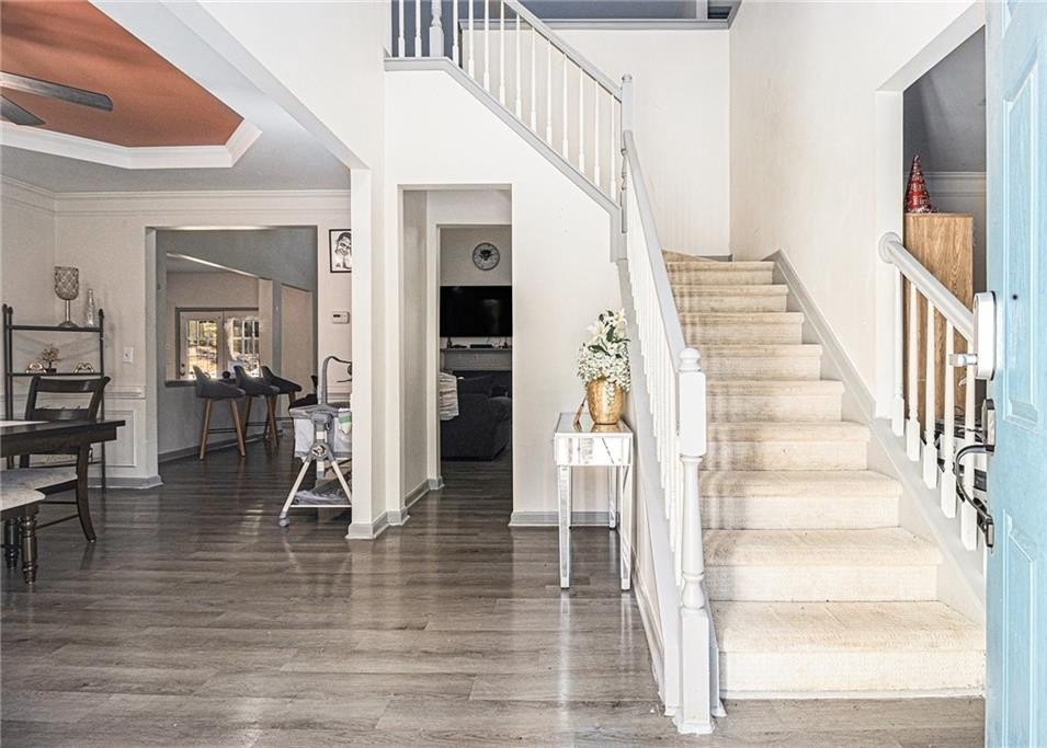 Recent upgrades include sleek gray laminate flooring, plush sandy beach carpet upstairs, and fresh interior paint just 2 years ago. Enjoy peace of mind with regularly serviced HVAC systems, all-new stainless steel appliances with a gas stove, a water softening filtration system, and new double-pane windows. Modern ceiling fans and updated hardware add a stylish touch throughout.