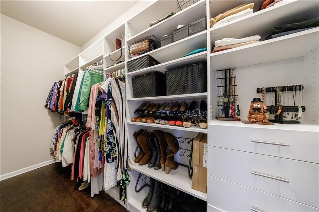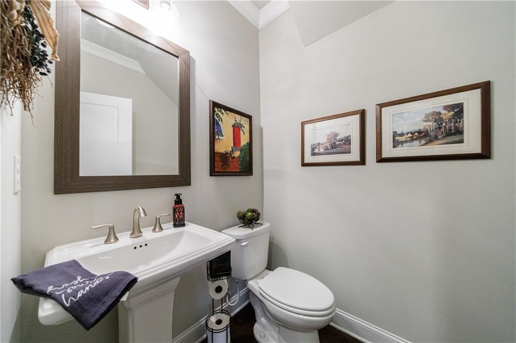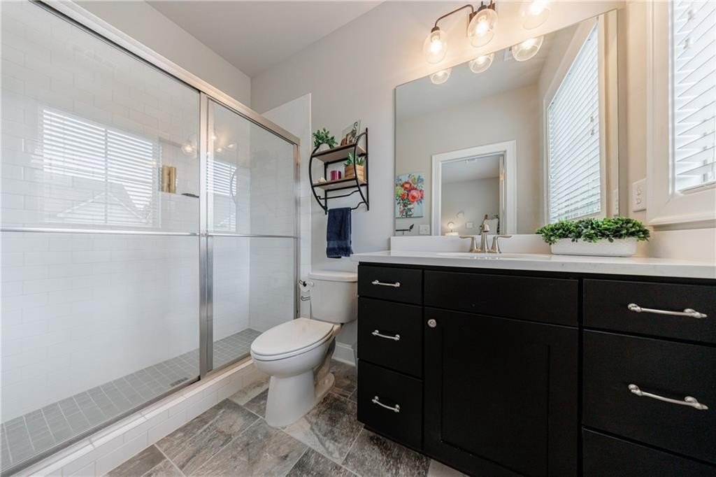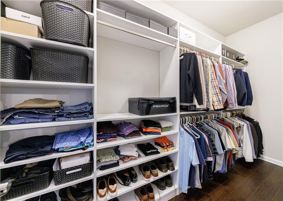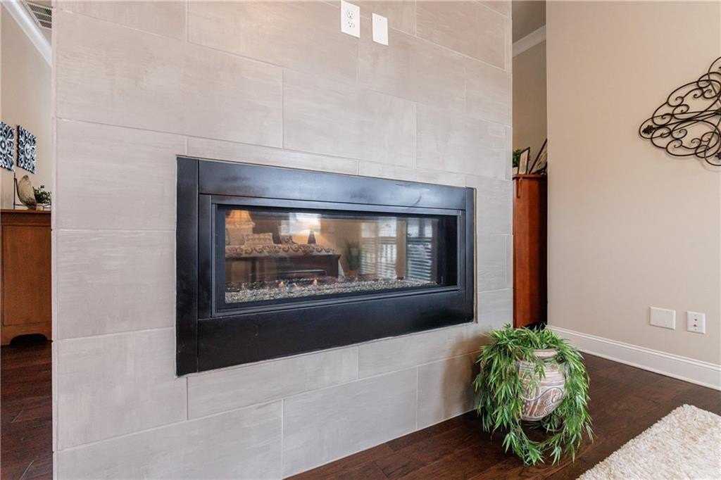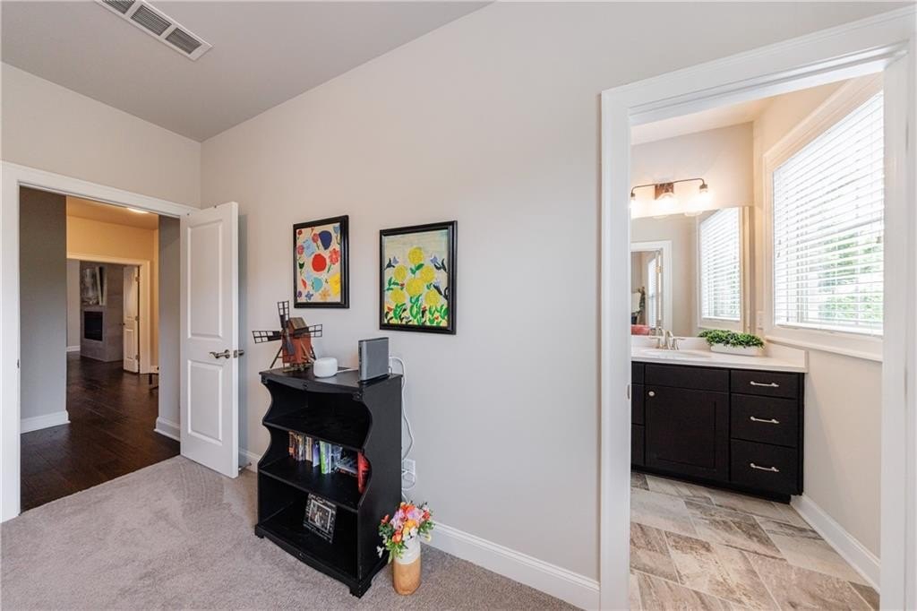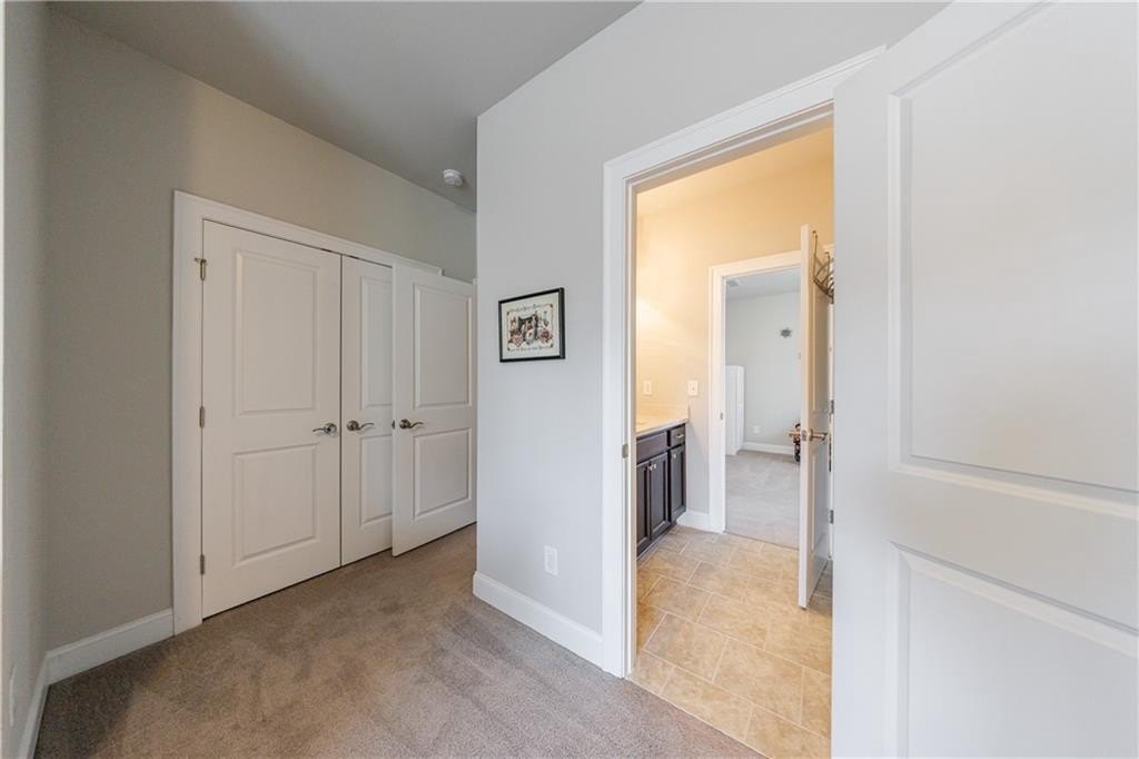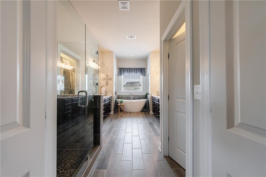 Upstairs on the mid-level, you’ll find three generously sized secondary bedrooms—one with a private en-suite and two sharing an adjoining bath. The luxurious primary suite offers a true retreat, featuring a double-sided fireplace, a private sitting room, and a screened-in porch. The spa-inspired primary bath includes double vanities, a large walk-in shower, a soaking tub, and two spacious custom walk-in closets for optimal organization.
