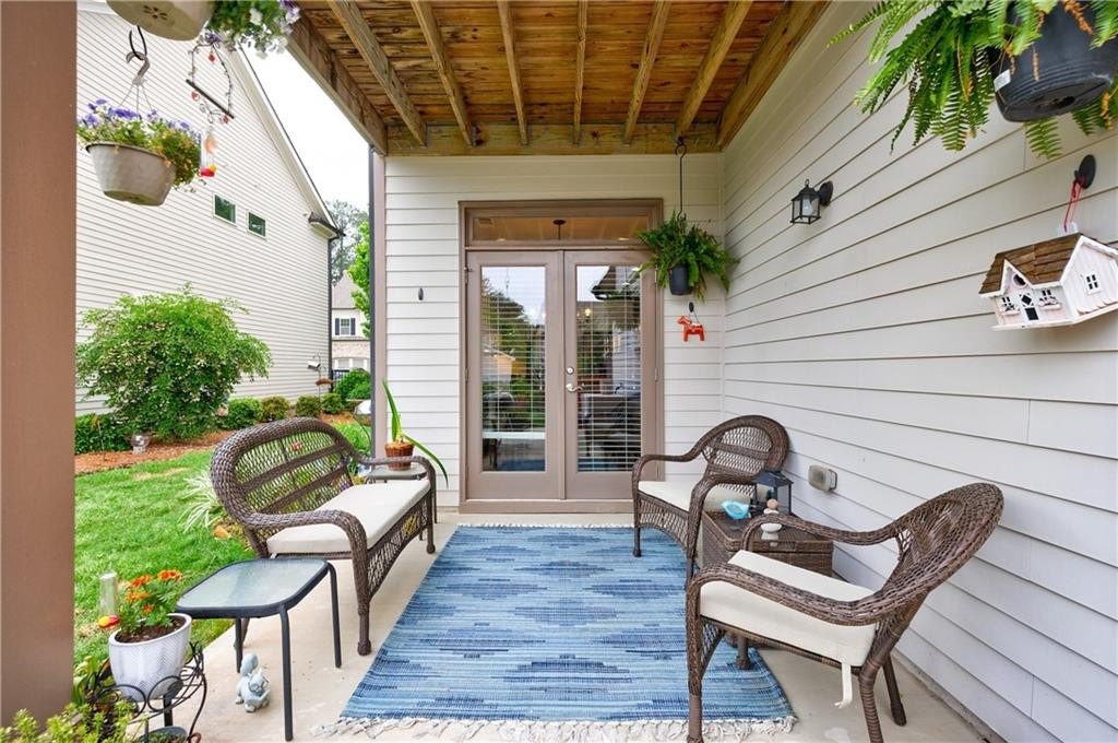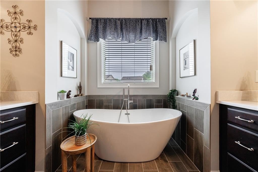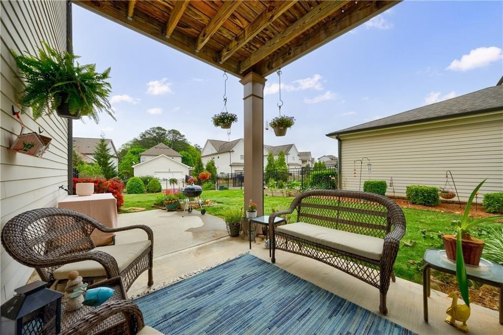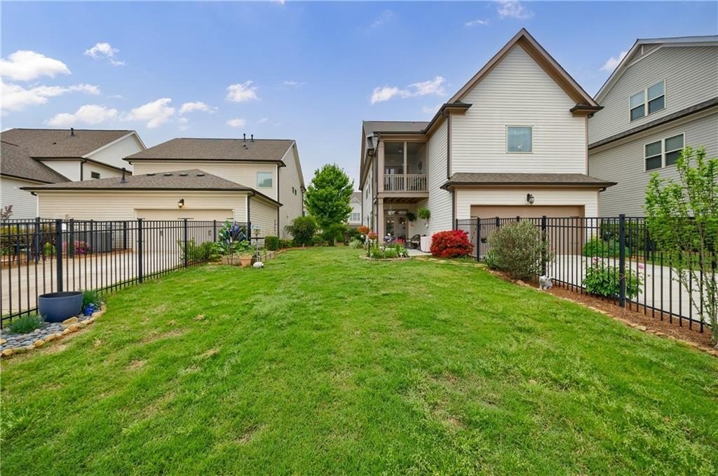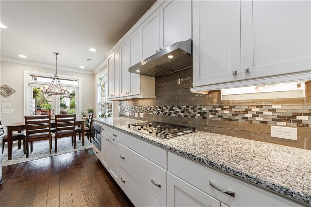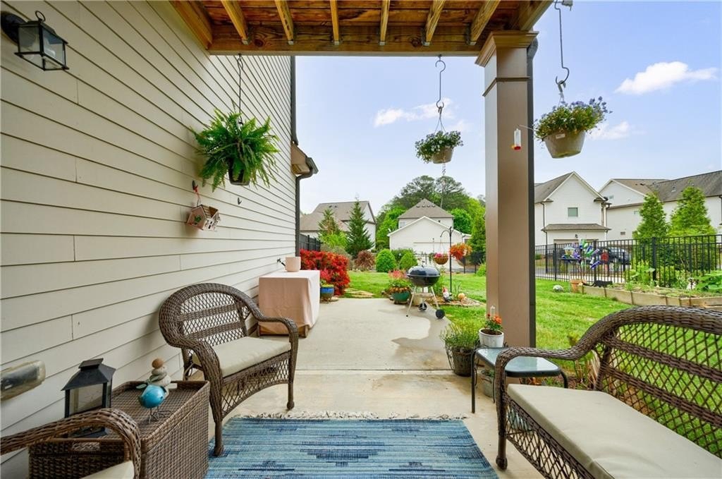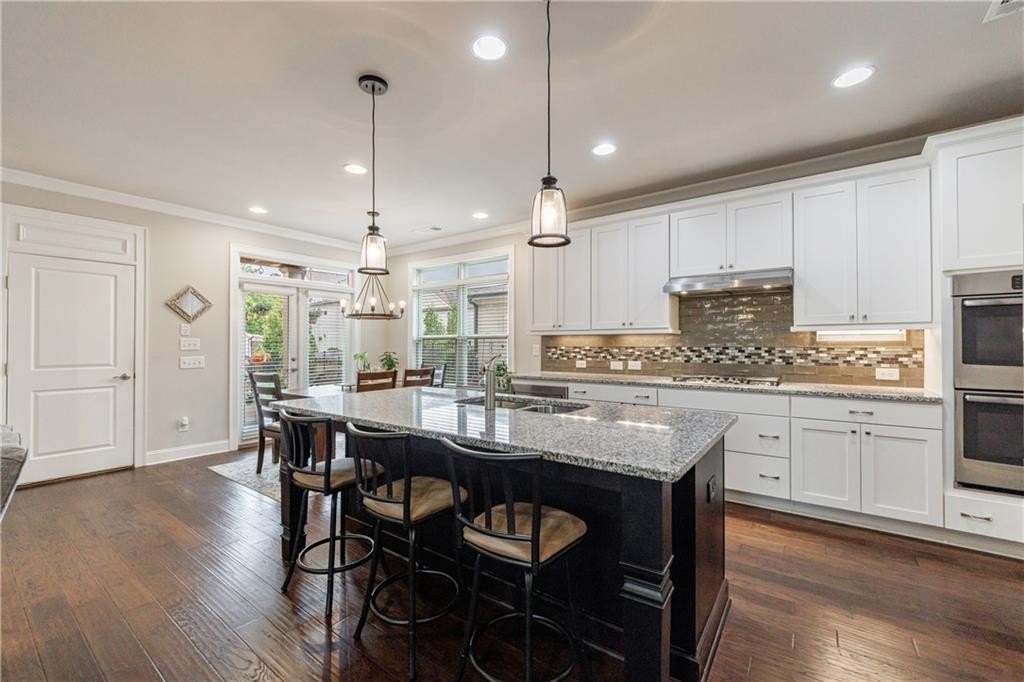 At the heart of the home, the chef’s kitchen is open to the central living space and equipped with leathered Granite countertops, double stainless steel ovens, a gas cooktop, and a bright breakfast nook. French doors lead to a covered patio, while an additional uncovered patio extends your outdoor living space. The fenced, level backyard is a rare find and is one of the largest in the community, ideal for entertaining or relaxing in privacy.