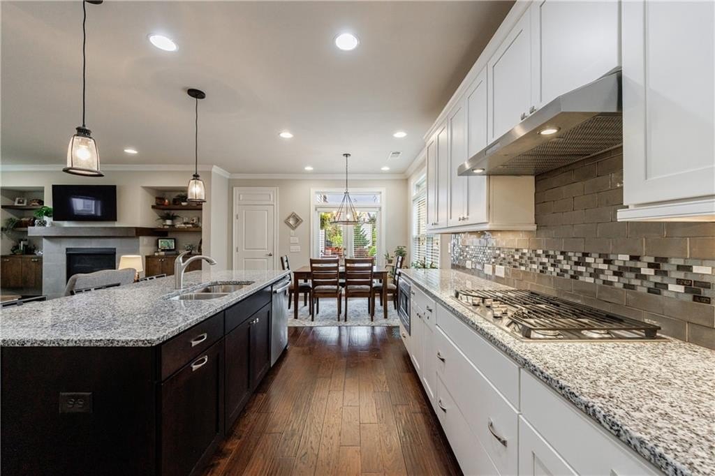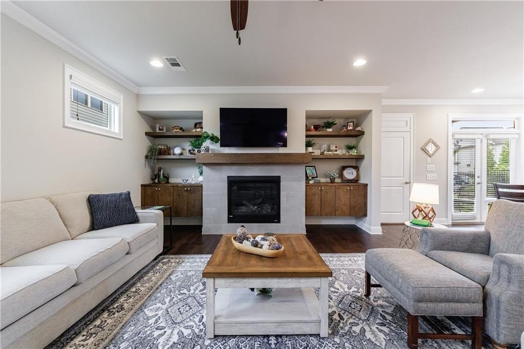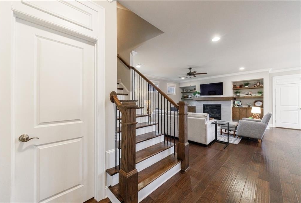 The inviting family room is centered around a gas fireplace flanked by custom built-in cabinets and open shelving. A formal powder room completes the main level.
