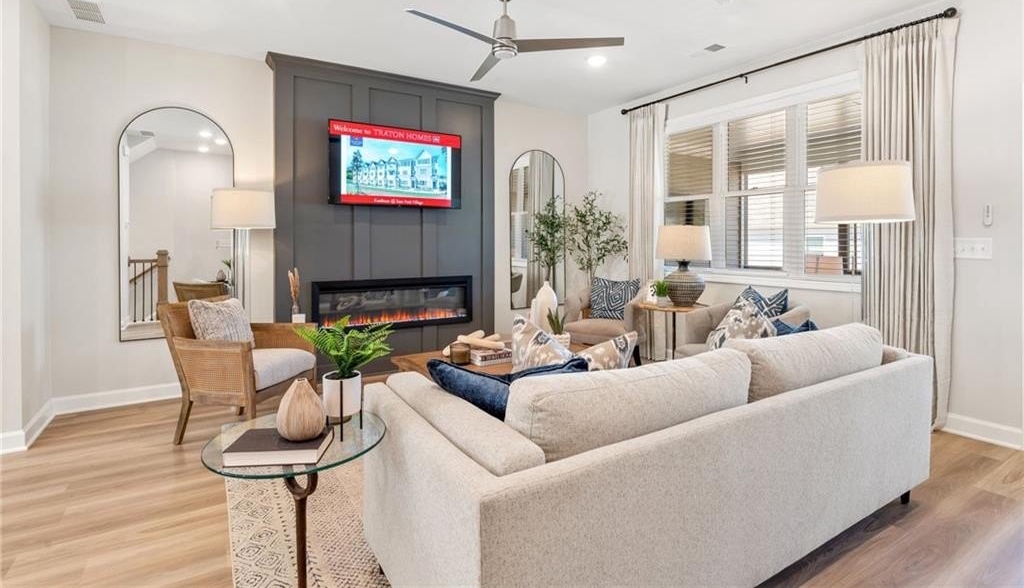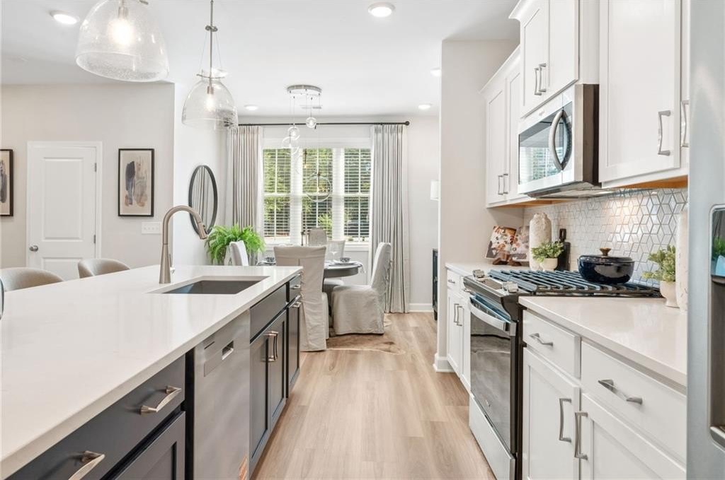 TRATON HOMES KAUFMAN "D" FLOORPLAN READY December! Traton Homes Incentive of $2,500 anyway you want it. UP to $10,000 closing costs with one of our Traton approved lenders. This beautiful three-story features a rear-entry two-car garage, a large ground-floor bedroom/flex room with full bath—ideal for a peaceful workspace or accommodating guests. Hardwood stairs lead to the main level, where you'll find a spacious open-concept layout. The kitchen offers shaker cabinets, quartz countertops, gas cooking, a large island that comfortably seats four, and a generous pantry. The expansive family room includes a sleek, modern electric fireplace that can provide heat or simply create a cozy ambiance. You'll also find a separate dining area and half bath on this level. Your family room opens to a 10'x18' covered deck, perfect for entertaining or simply relaxing. The upper level is where you'll discover the king-sized owner's suite. The primary bathroom offers a large vanity with dual sinks, drawers and large shower with a bench. A secondary bedroom suite on the opposite end of the primary bedroom. The laundry closet is between these 2 bedrooms and offers privacy and convenience. East Park Village checks all the boxes! Its prime location is approximately 1.5 miles to I-75 and 1.2 miles downtown Kennesaw. East Park Village was voted the best neighborhood in Cobb County by Cobb Life Magazine 2024, and USA Today recognized Kennesaw as the best place to live in Georgia. Great amenities include a pool, cabana with fireplace and restrooms and a dog park. Some photos are REPRESENTATIVE of this home, same Kaufman floor plan. DECORATED photos are of the model. All applicants must prequalify with a Traton Homes preferred lender regardless of who you choose for your loan.