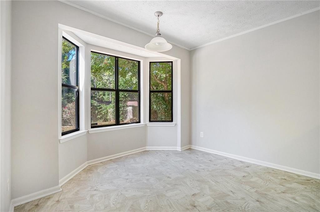 breakfast nook, and unwind in the vaulted living room featuring wood-beamed