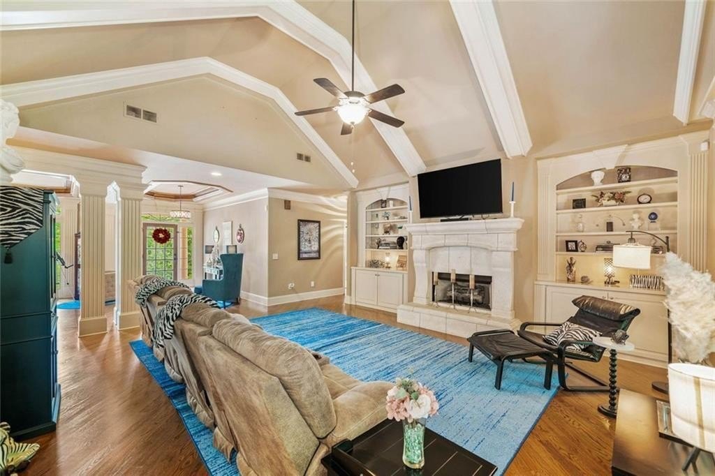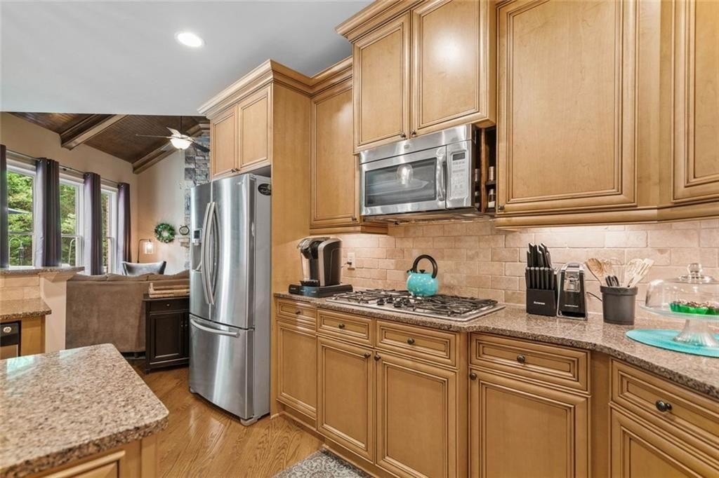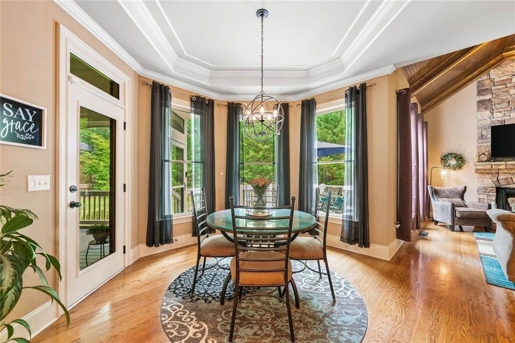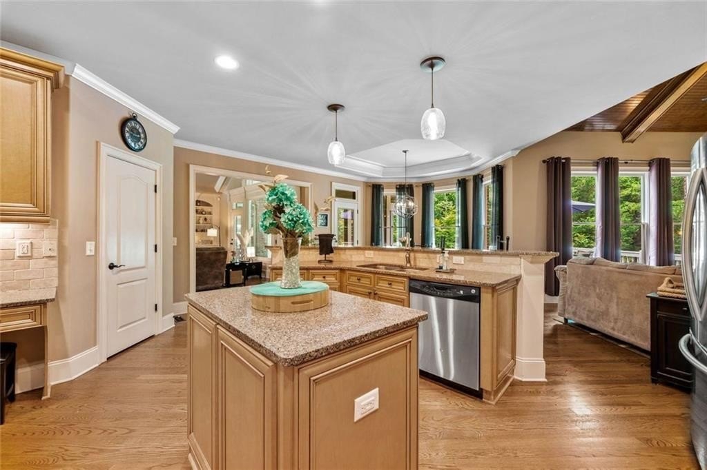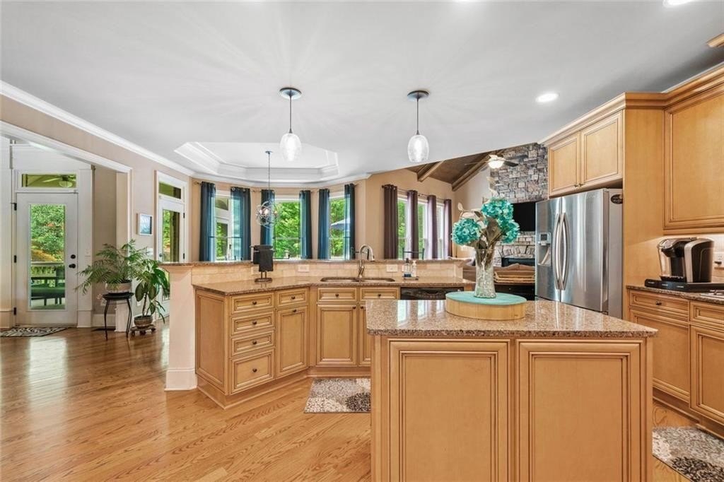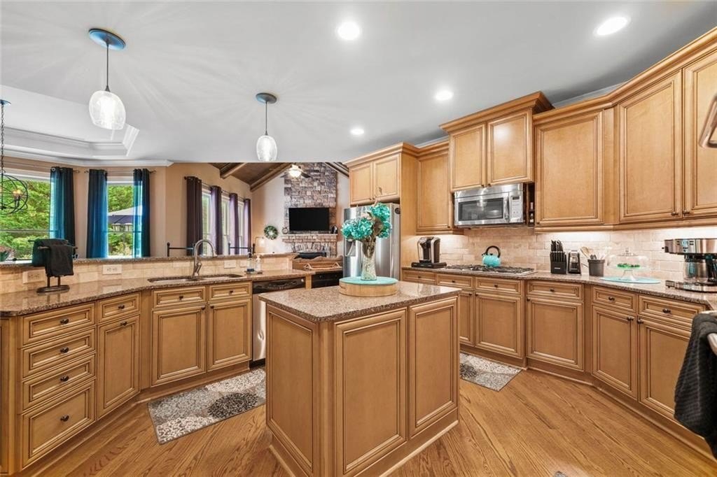 Inside, vaulted and tray ceilings draw your eye to the picturesque windows across both the front and back of the home, flooding the main level with natural light. Hardwood floors run throughout, leading you into a spacious open kitchen featuring granite countertops, stainless steel appliances, walk-in pantry, and a cozy vaulted keeping room with a gas fireplace.