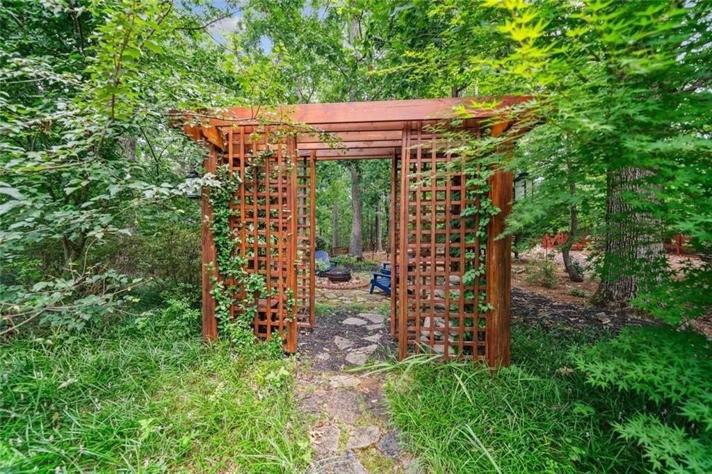 The backyard is a showstopper with an arbor-covered nature trail, fire pit with Adirondack chairs, hot tub, overlook with long-range mountain views, built-in horseshoe pit, and fully fenced yard. An automatic irrigation system with rain sensor keeps the abundant landscaping thriving, and landscape lighting sets the scene for evenings outside.