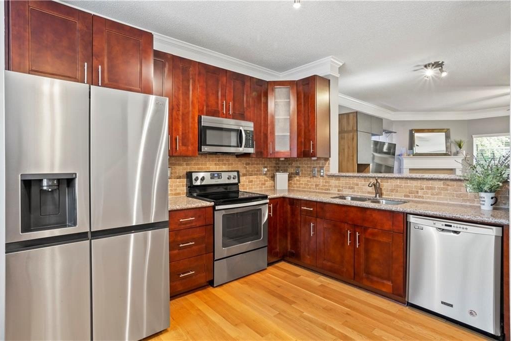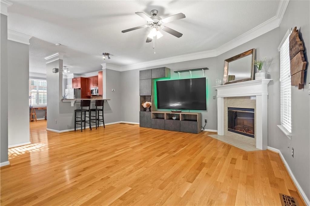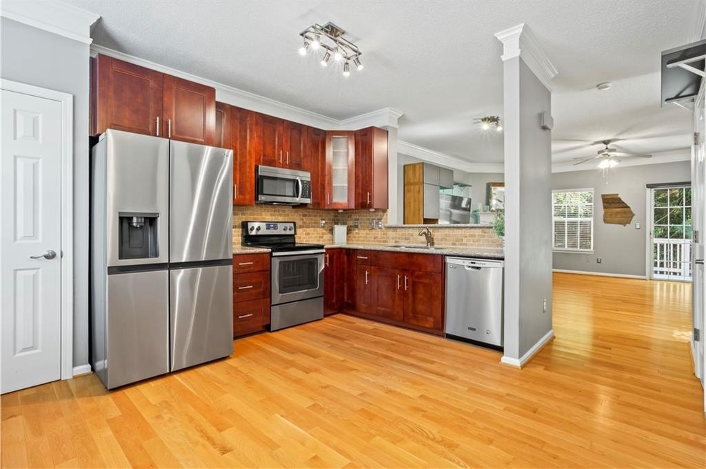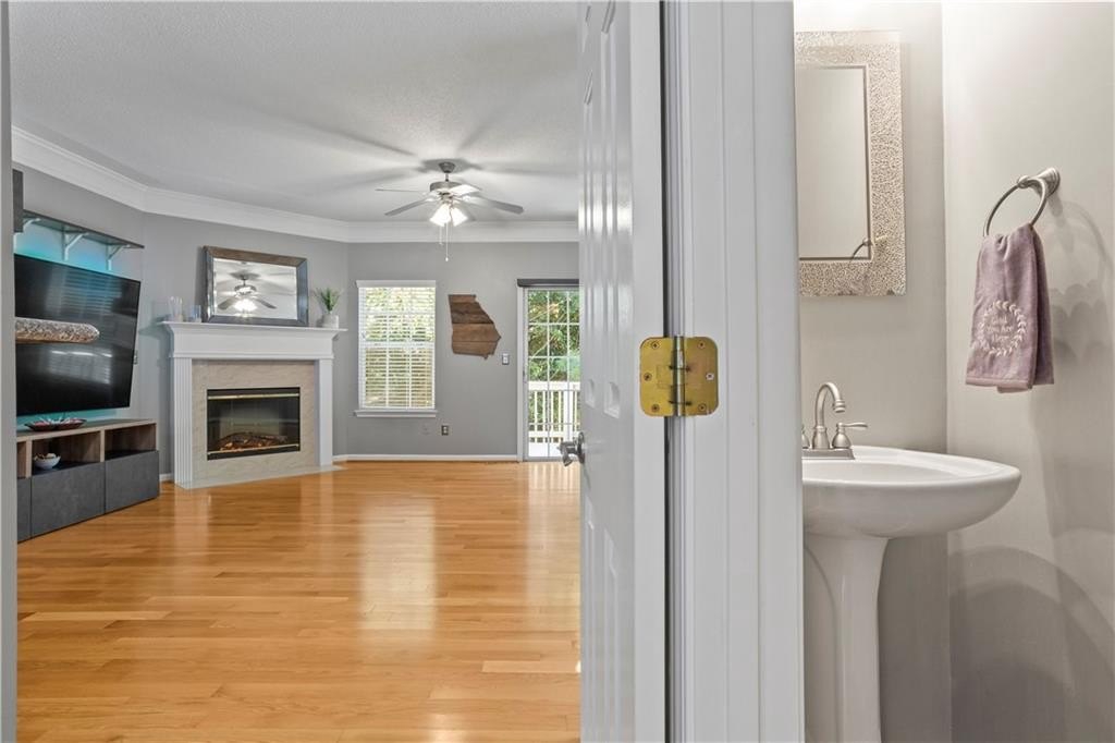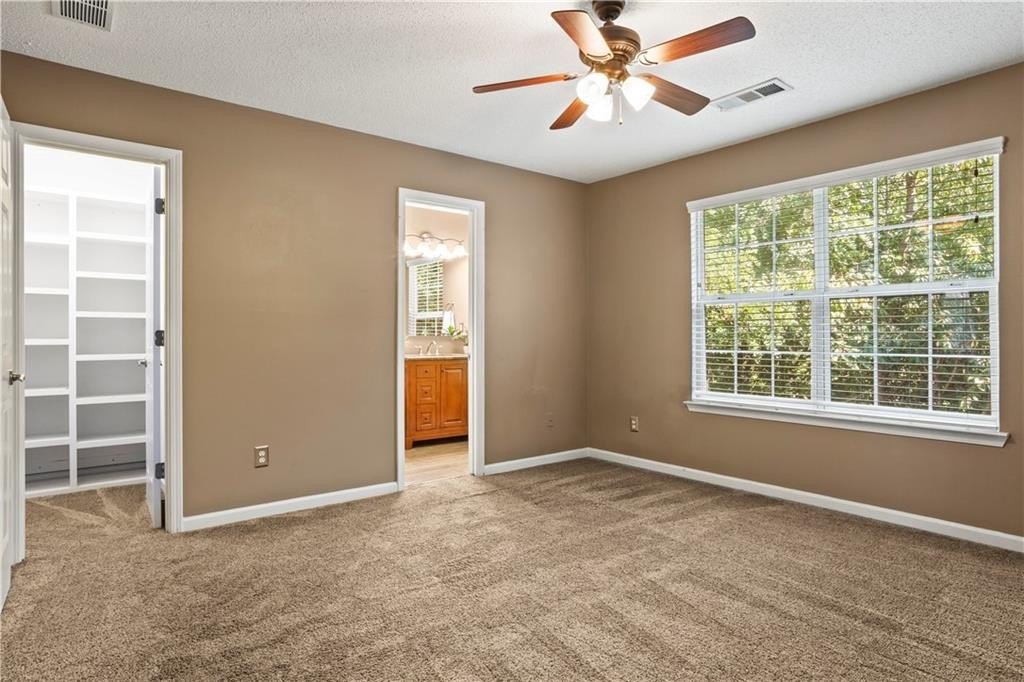 Calling all influencers, podcasters or gamers - quiet lower-level bonus room is a perfect creative/studio space!!! This gated end-unit townhome features a convenient roommate-type floorplan with 2 primary bedrooms/baths upstairs, plus a bonus bedroom/office/gaming room on the lower level. Open main level with eat-in kitchen and large living room. TWO-car garage, two new HVAC systems (2022/2023), new hot water heater (2024), new roof and whole house surge protector. HOA fee Of $225/month covers, roof, exterior maintenance (paint, etc.), landscaping, pool, playground, and common-area maintenance. Walk to Starbucks and shopping; enjoy the community pool; enjoy secure gated access. VERY clean; move in and relax! Commuters...enjoy QUICK access to both I-75 and I-575; also very close to KSU.