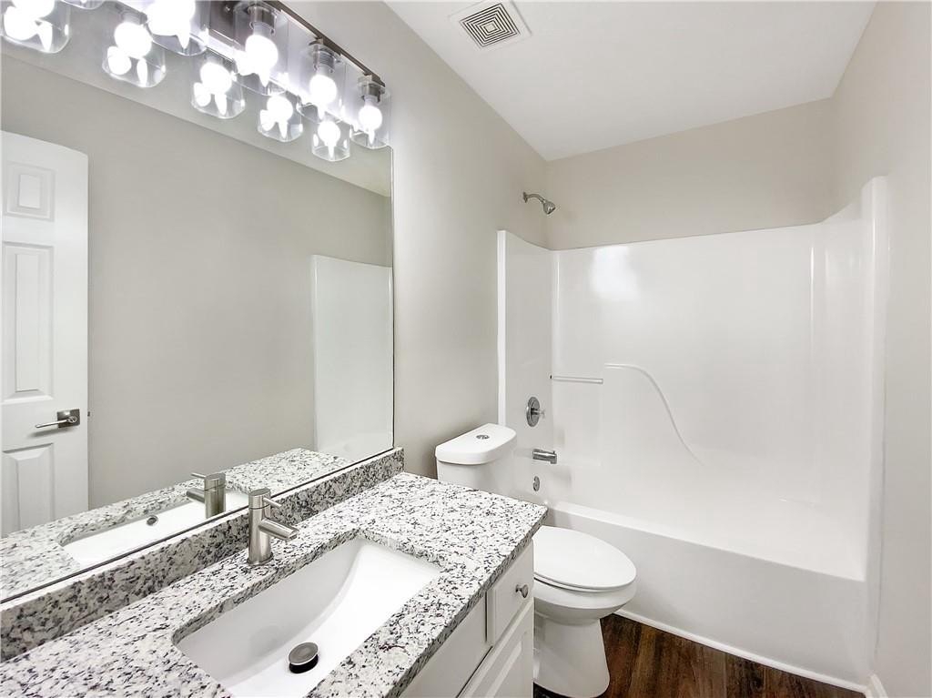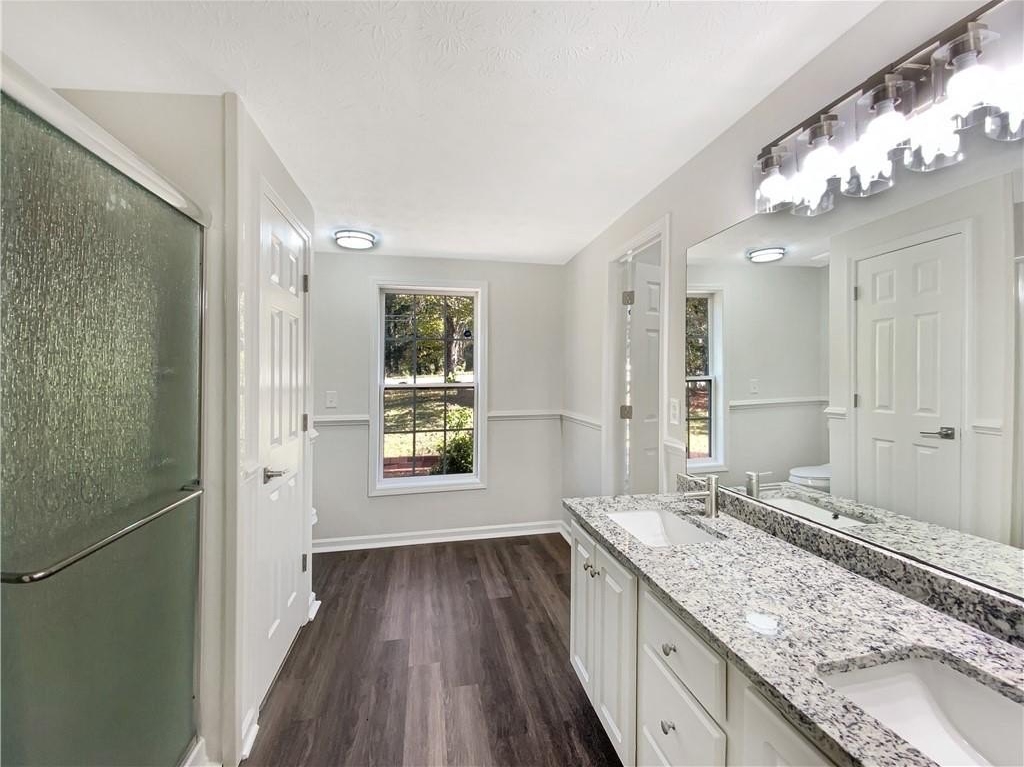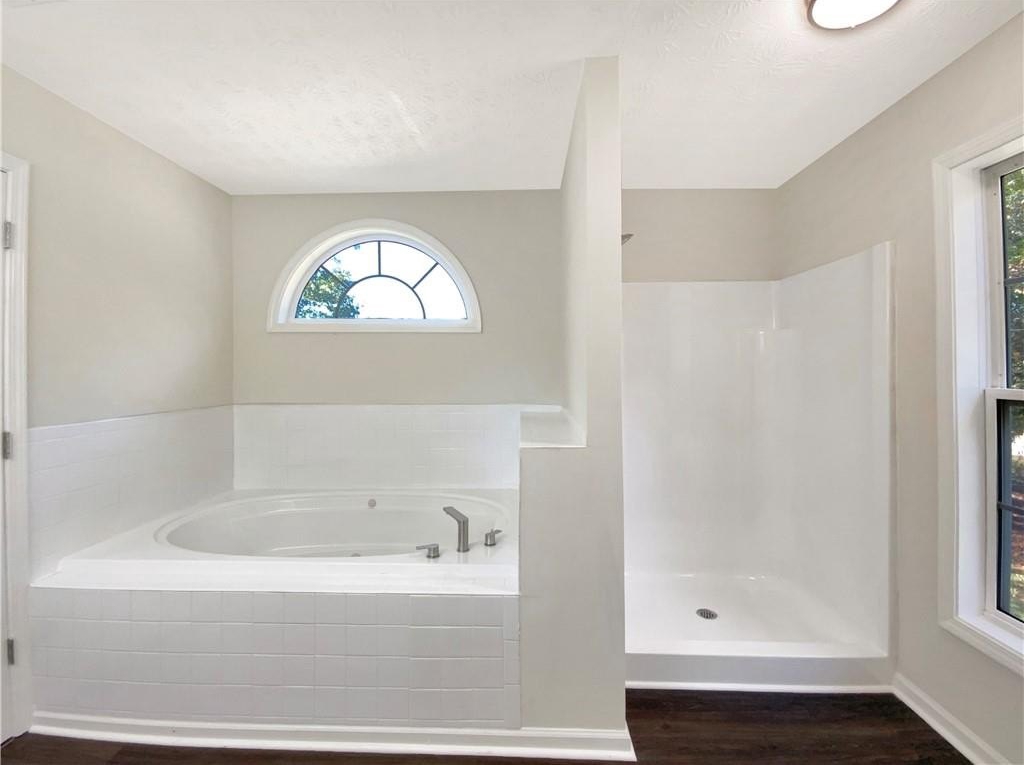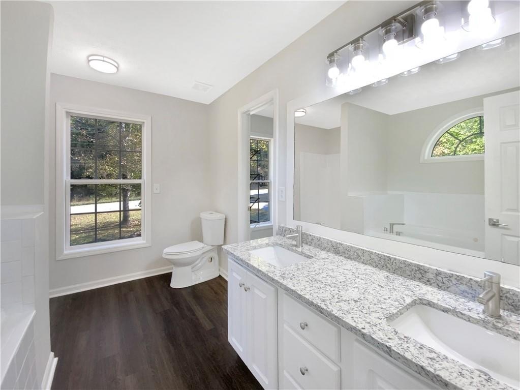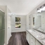 dual vanities, quartz countertops, a separate soaking tub and shower,