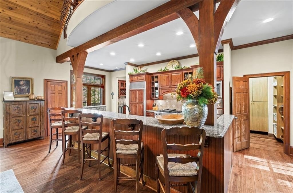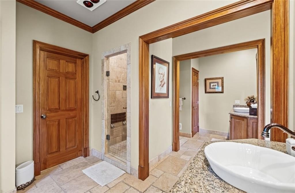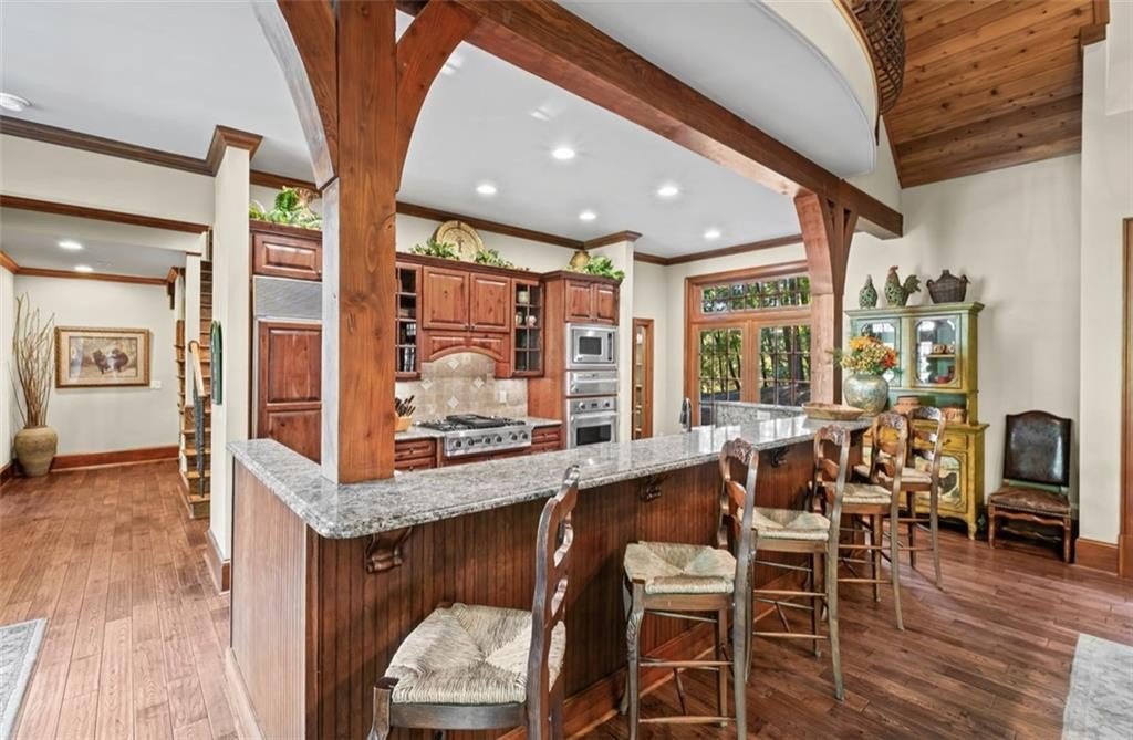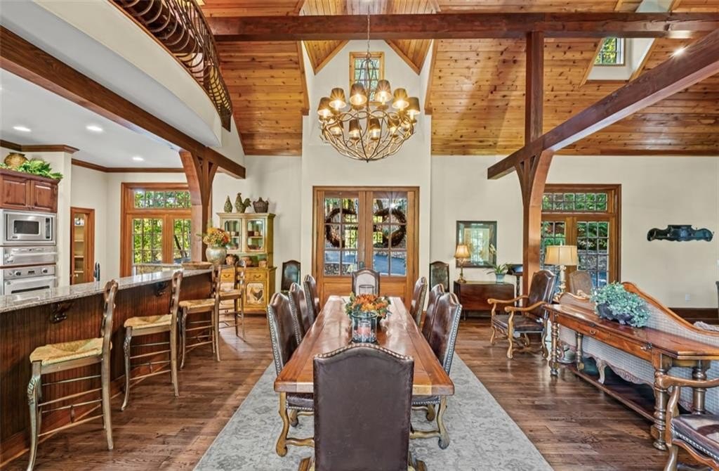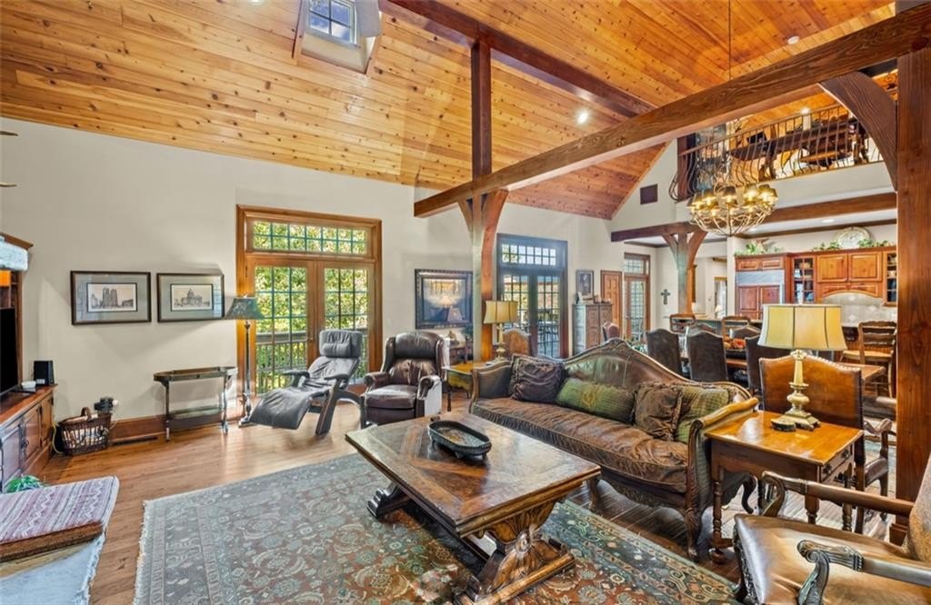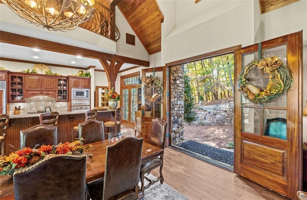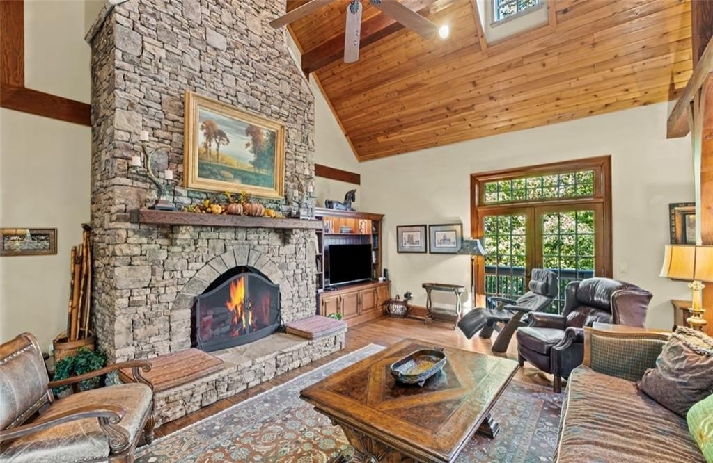 Opportunities Like This Rarely Come Along... Tucked away on one of Big Canoe's most exclusive lakeside locations, this expansive European-style villa offers an unparalleled waterfront lifestyle. And it can be sold Turn-Key! With only one owner since construction, this exquisite villa exudes timeless elegance and privacy, perfectly nestled with big views along the tranquil shoreline of Lake Petit. Encompassing over 7,000 sq feet of classic old world architecture, with multiple wings for family and guests. The Great Room features a cathedral ceiling with heavy timber beams, a grand stacked-stone fireplace rising to the roofline, and walls of glazed French-doors opening to the lake-facing decks and balconies. The home features exquisite finishes throughout, including Viking and Sub-Zero appliances, granite countertops, and two striking Tennessee fieldstone fireplaces. The luxurious owner's suite includes a spacious sitting room, a walk-through steam shower, dual water closets, and an Air Bain jet tub for ultimate relaxation. The terrace level offers a versatile retreat with a bunk room, second kitchen, and additional master suite-ideal for guests or extended family. A detached three-car garage includes a finished space above, perfect for an in-law suite, private office, or studio. This home combines the grace of European design with the serenity of lakeside living-an exceptional opportunity in one of Big Canoe's most coveted locations.