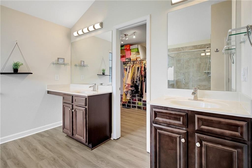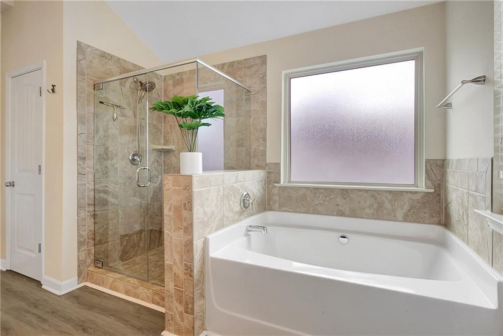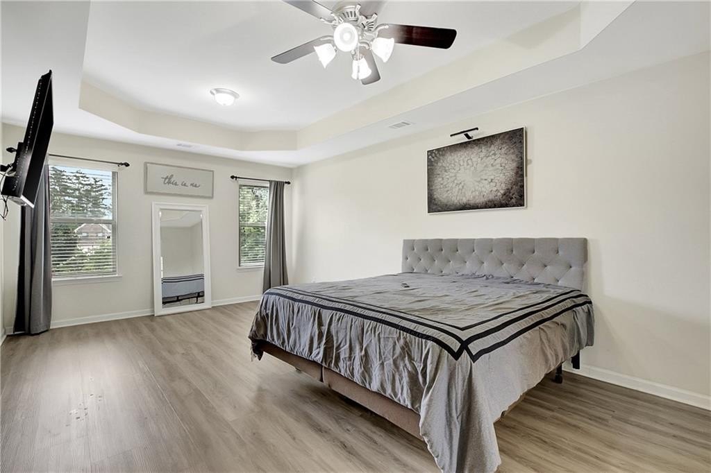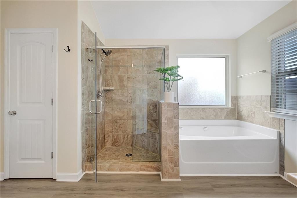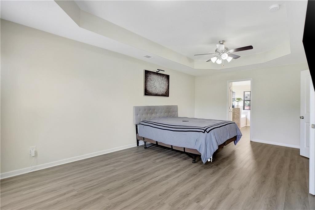 Retreat to the expansive primary suite, complete with a double-door entry, tray ceiling, and a luxurious ensuite bath featuring dual vanities and a Roman soaking tub.
