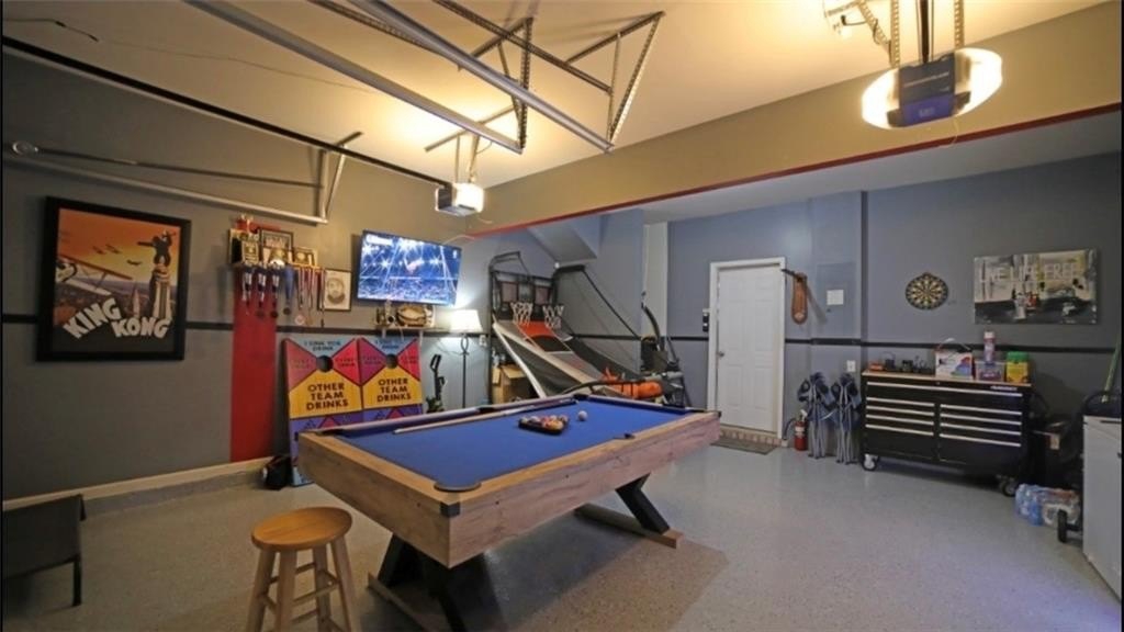 The insulated garage with epoxy flooring offers flexible space—perfect for a home gym, game room, or man cave.