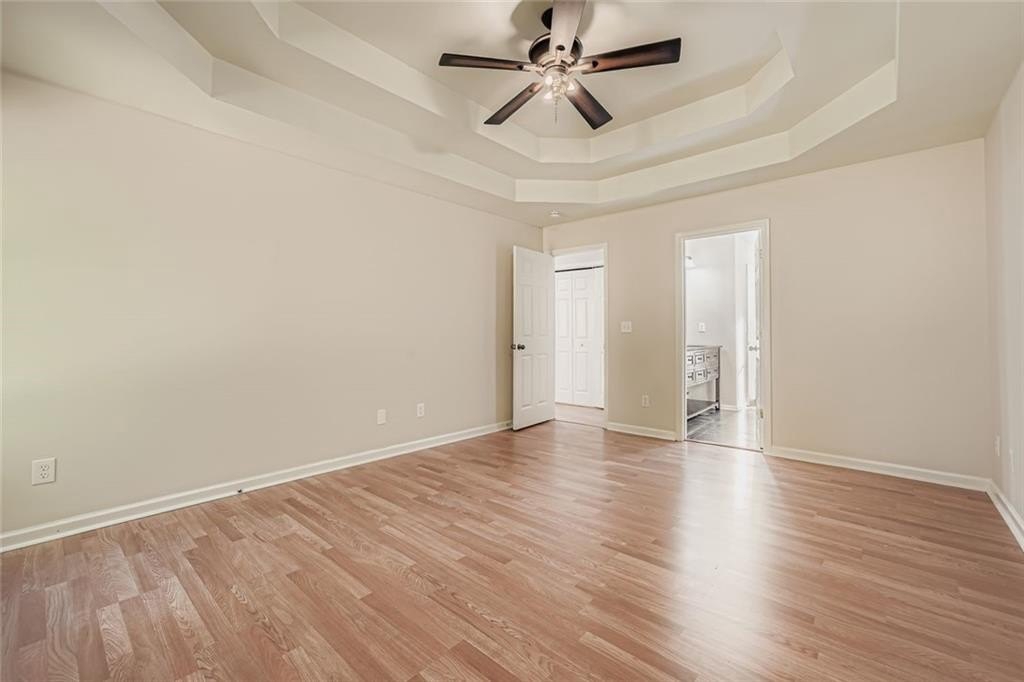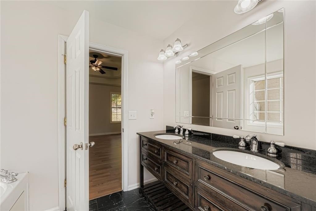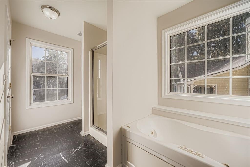 The primary suite provides a relaxing retreat with a large bathroom featuring dual vanities, a soaking tub, and a separate shower. Two additional bedrooms offer flexibility for guests, a home office, or playroom.