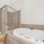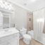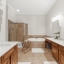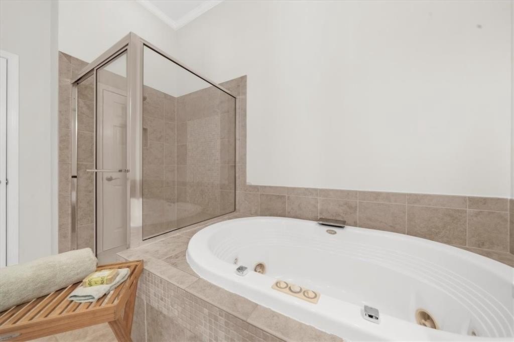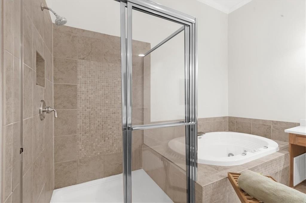The main level also includes a versatile media/guest room with full bath and bay window views of the nature trail and creek. Upstairs, the primary suite offers double doors, vaulted ceiling, two walk-in closets, and a spa-like bath with separate vanities, soaking tub, and accessible shower. An additional guest suite with full bath, a reading nook/office, and a laundry room complete this level.
