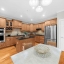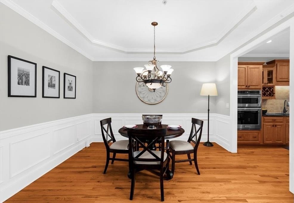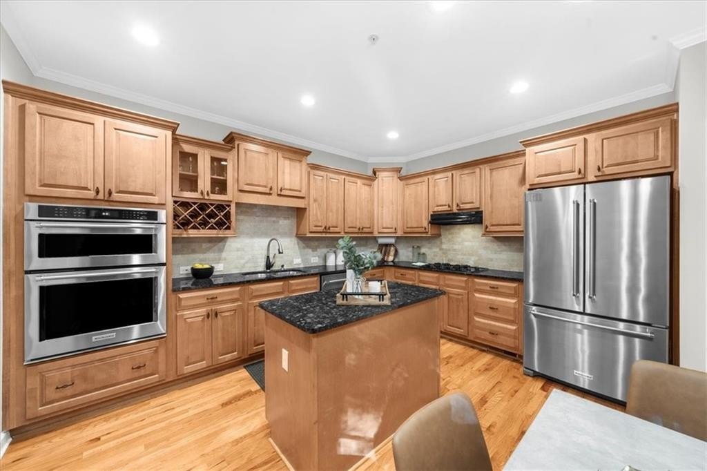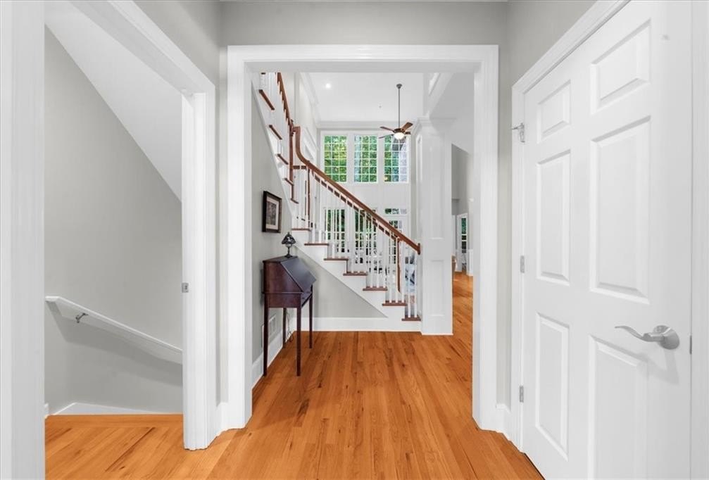 The open, flowing floor plan features true hardwood floors throughout the main and upper levels, a two-story foyer (elevator-ready if desired), and a two-story living room with fireplace and built-in bookcases. The large kitchen, updated with new KitchenAid appliances (2023), includes ample cabinetry, a center island, and direct access to the dining and living areas. Off the living room, enjoy a new Trex deck overlooking the seven-acre protected nature preserve, a private and peaceful setting connected to the ALPHA LOOP TRAIL.