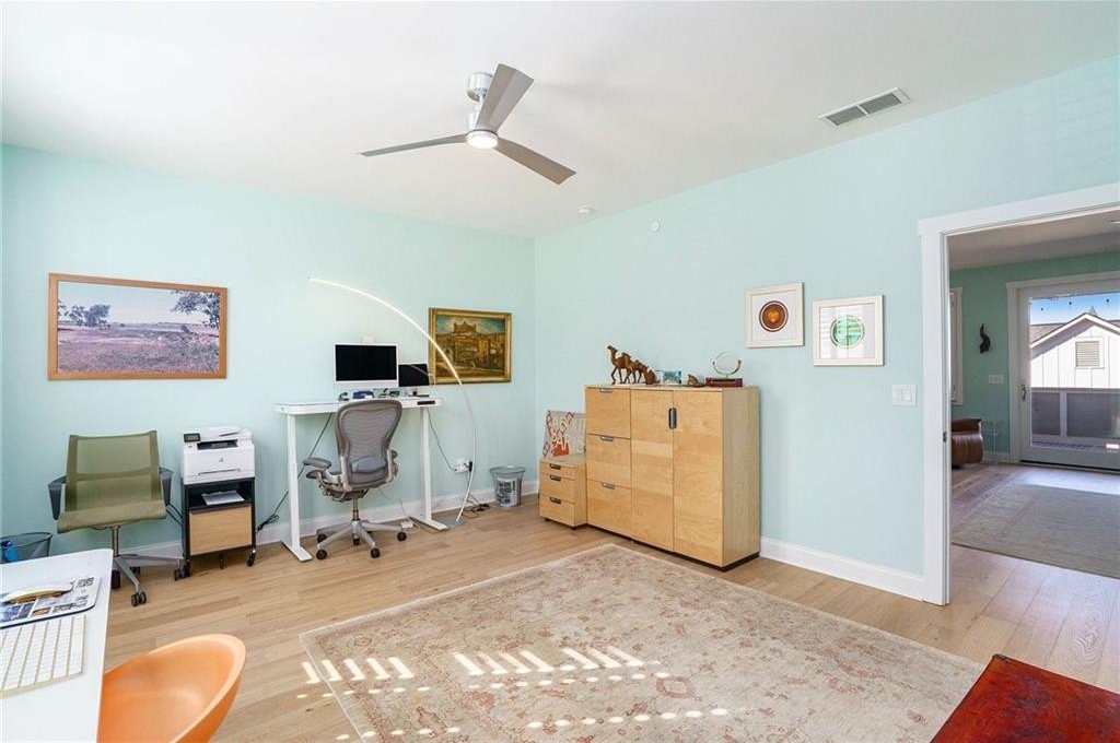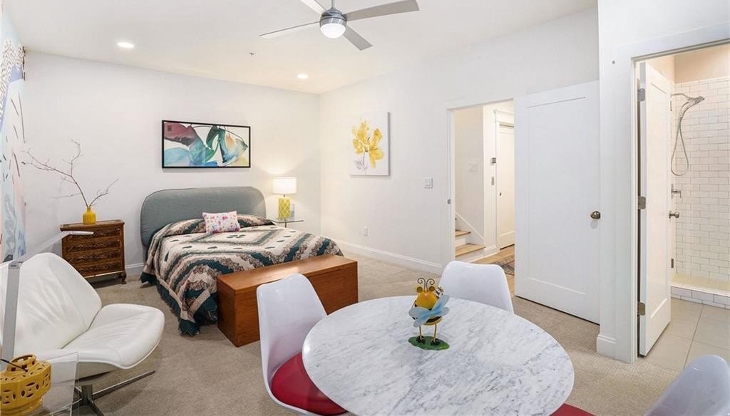 The top floor is designed for entertaining and relaxation, featuring a spacious living area and an expansive rooftop deck showcasing panoramic views of Kennesaw Mountain and Downtown Marietta—ideal for sunsets and fireworks.