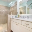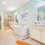 The primary suite includes a large custom walk-in closet and a spa-inspired bath with a freestanding soaking tub, frameless glass shower, and new shower fixtures and lighting. Each secondary bedroom features an en-suite bath with updated lighting and plumbing hardware.