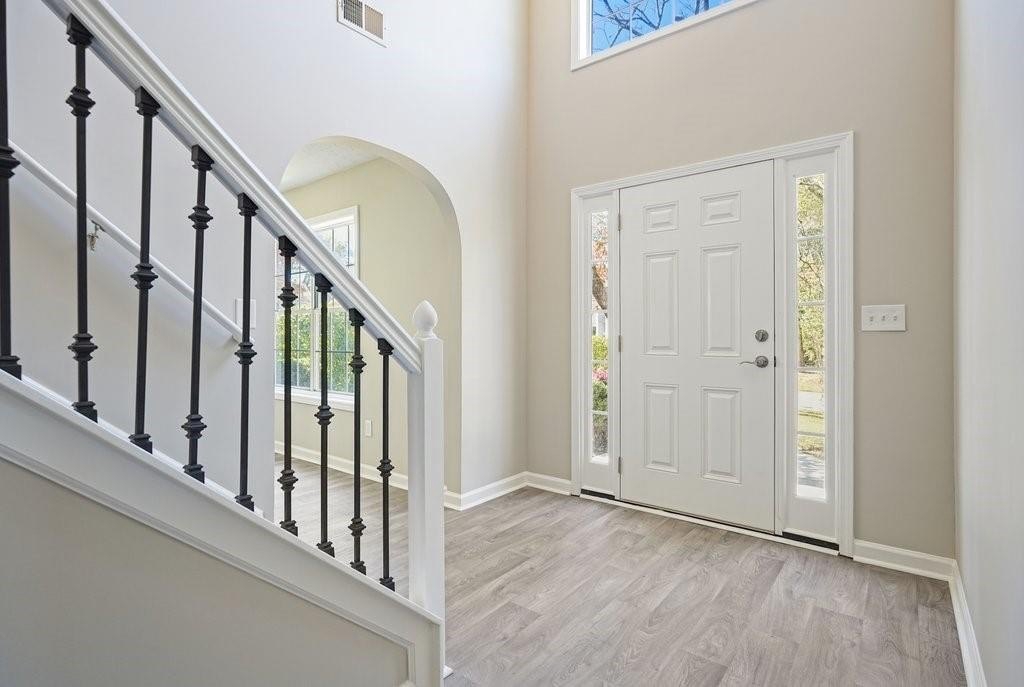 Outside, there’s a new roof with architectural shingles, new siding on the chimney, and a full exterior repaint with new trim and caulking. The home also has a new front door with sidelights, a new upstairs HVAC system (R-32 package), new door hardware and deadbolts throughout, new wrought-iron stair balusters, and updated landscaping with fresh brown mulch.