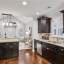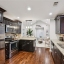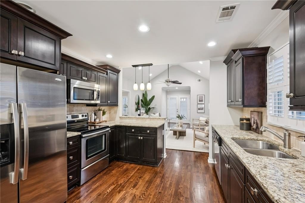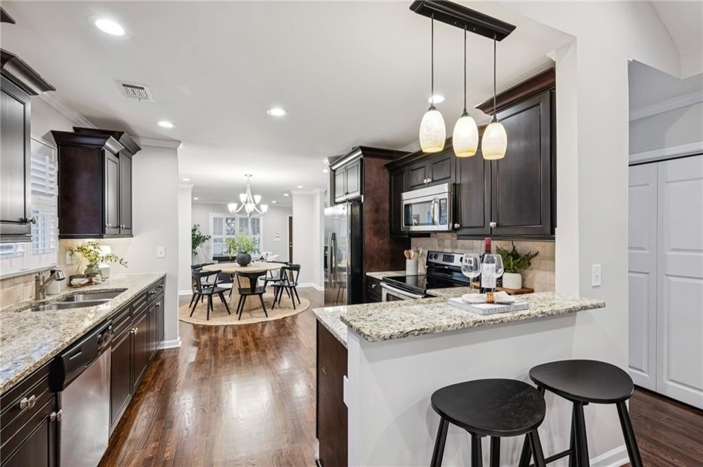 The kitchen includes granite counter tops, stainless steel appliances, stained cabinetry, peninsula with seating, and tile backsplash.