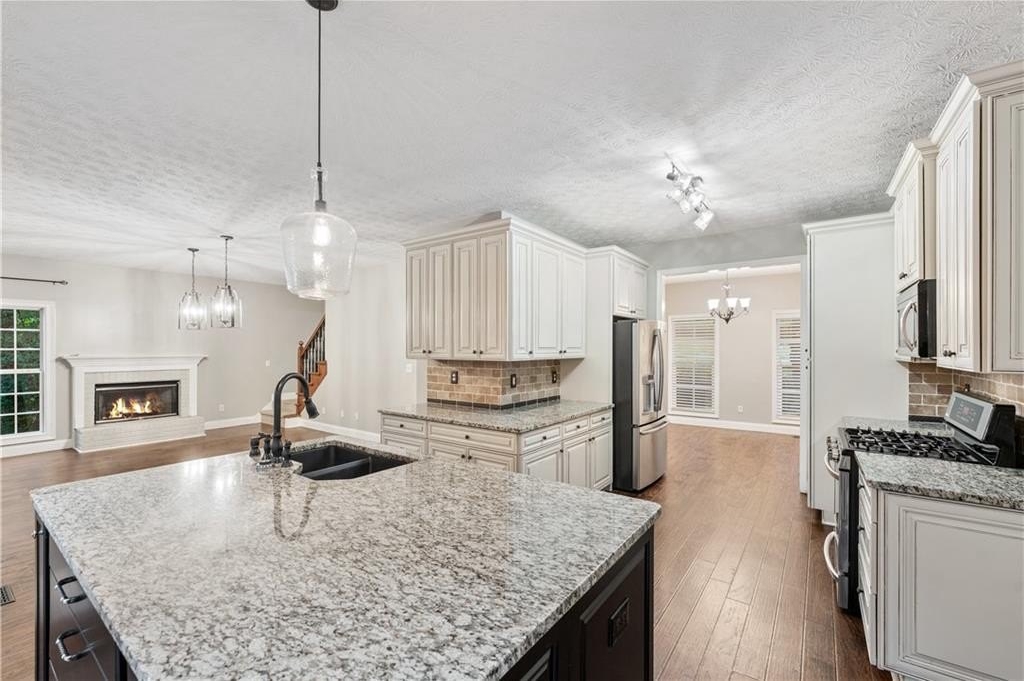 The stunning kitchen anchors the home with granite countertops, stainless steel appliances, a generous island, and plenty of cabinetry for storage and prep. Whether hosting friends or enjoying a cozy family dinner, this space delivers both style and function.