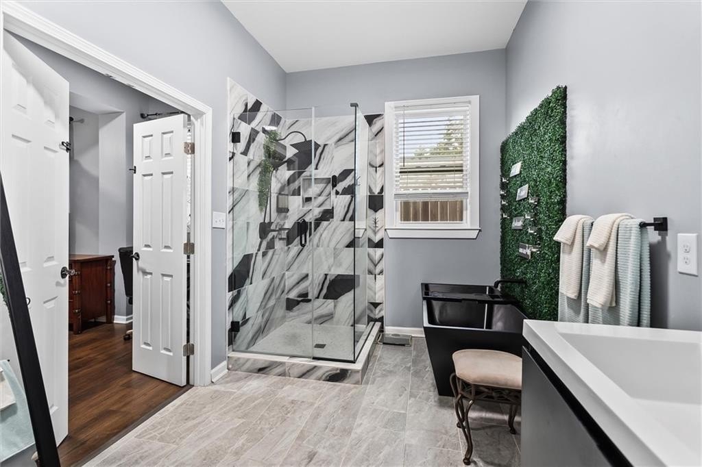 Step inside to find 10’ ceilings, an open-concept layout, and solid structural enhancements including wooden beams, waterproofing, an expanded HVAC system, and a durable brick–concrete–steel foundation. The primary suite on the main level is quietly tucked away, featuring a standalone bowl-shaped soaking tub and serene atmosphere.