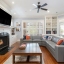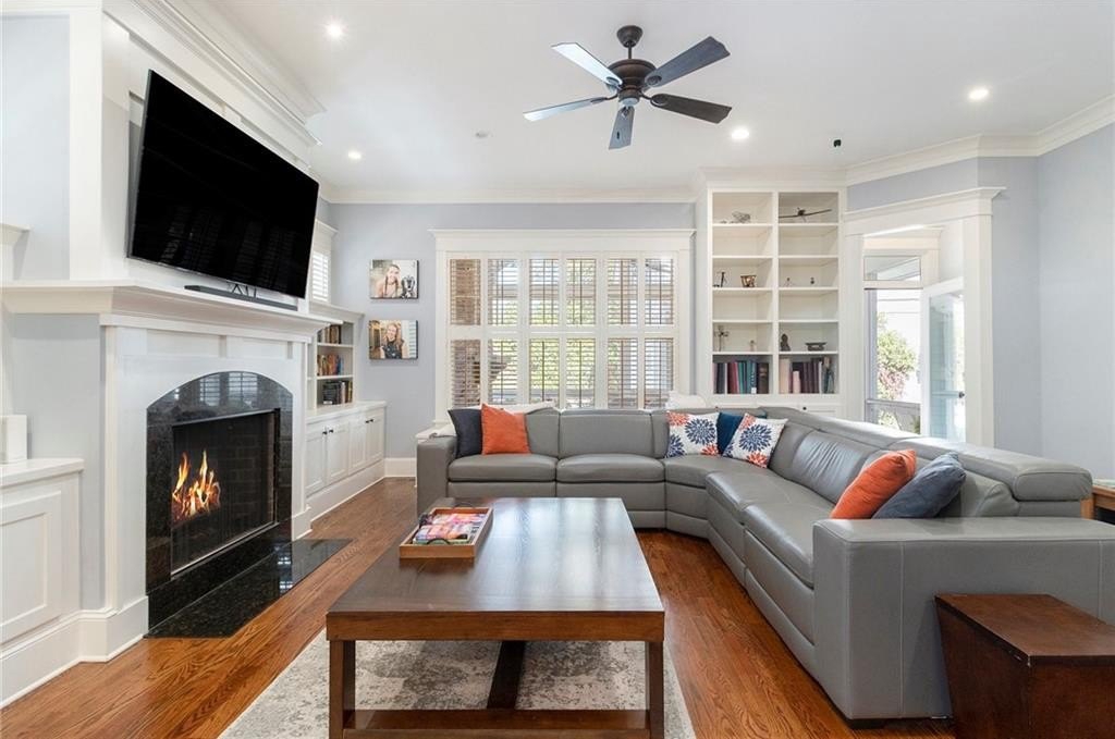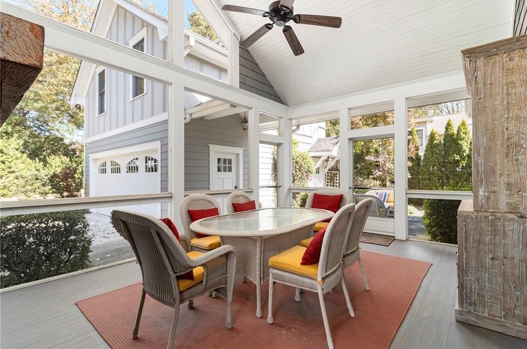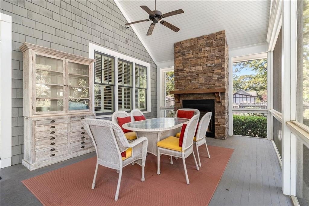 The living room features built-in bookcases, a cozy dining nook, and a beautiful custom fireplace—perfect for entertaining or relaxing. Step outside to the screened-in back porch, where high ceilings, painted wood floors, and a grand stacked-stone fireplace create a year-round retreat.