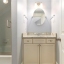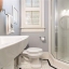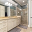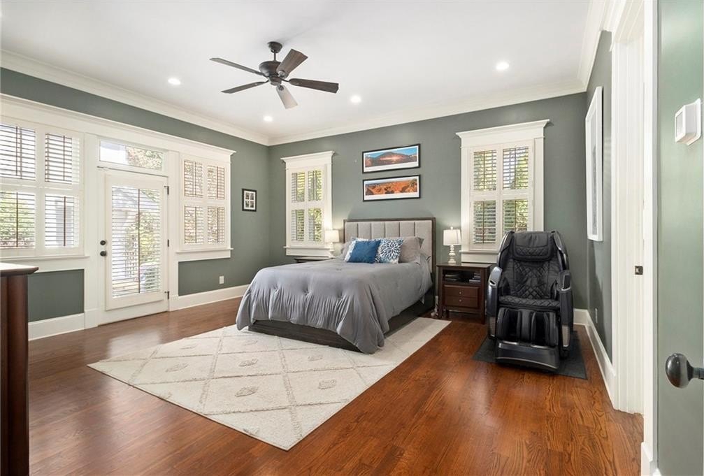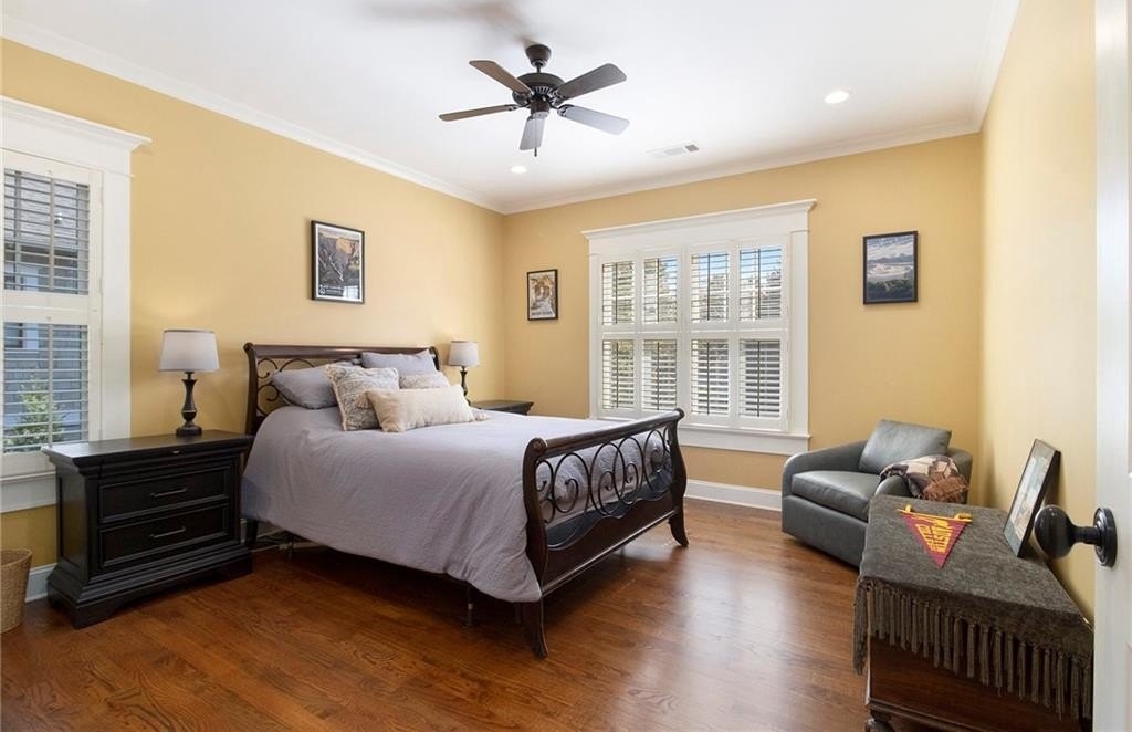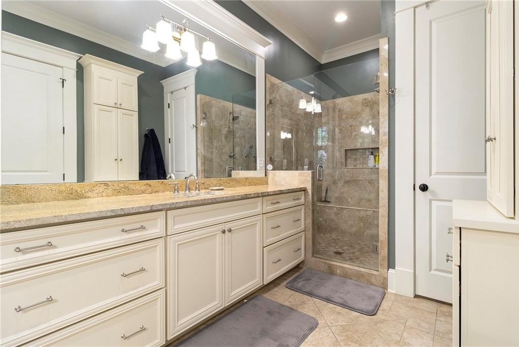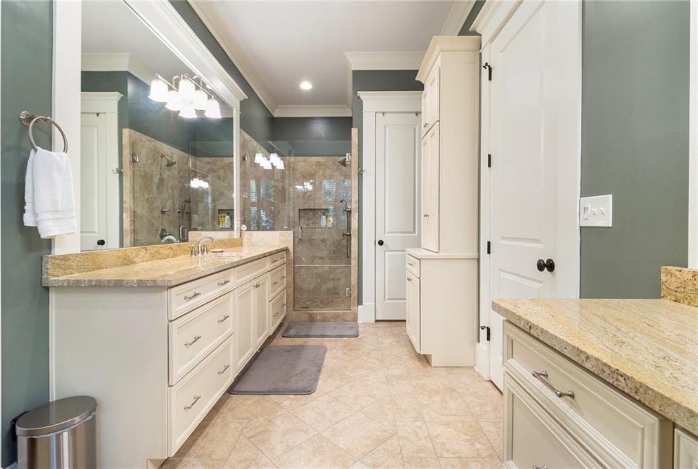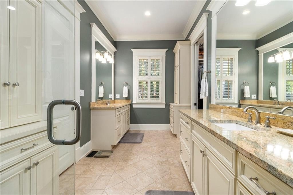 The luxurious main-level primary suite includes space for a sitting area and a wall of windows overlooking a private patio. The spa-inspired bathroom offers dual vanities, custom cabinetry, and an all-glass luxury shower. A massive his-and-hers walk-in closet includes built-in storage and a “secret” door to the laundry room. A full guest bath and separate laundry area complete the main floor.
