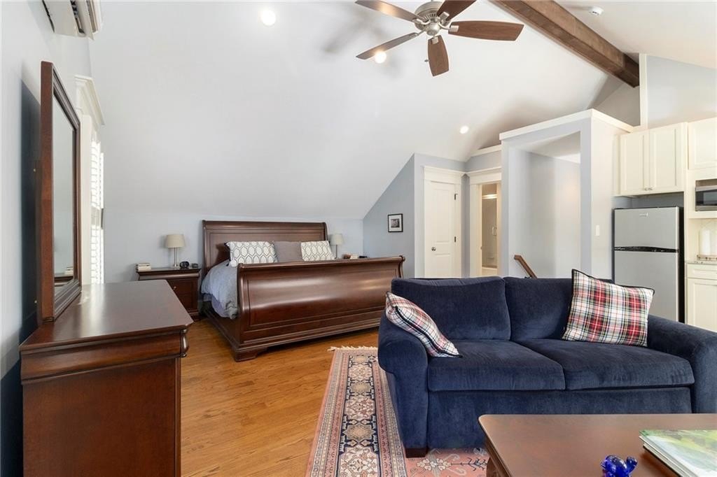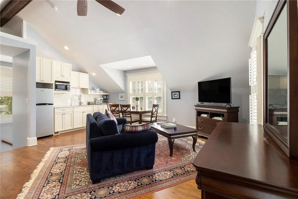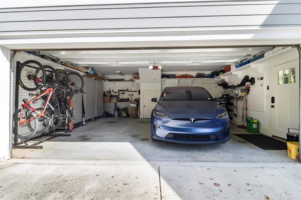 Out back, the detached two-car garage includes a workbench, shelving, three Tesla electric car chargers installed and a back up power source. Above it, a fully equipped apartment offers a kitchenette with microwave and fridge, full bath, and open living/sleeping area—ideal for guests, in-laws, college students, or rental income.