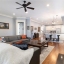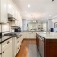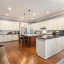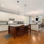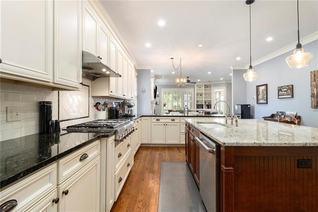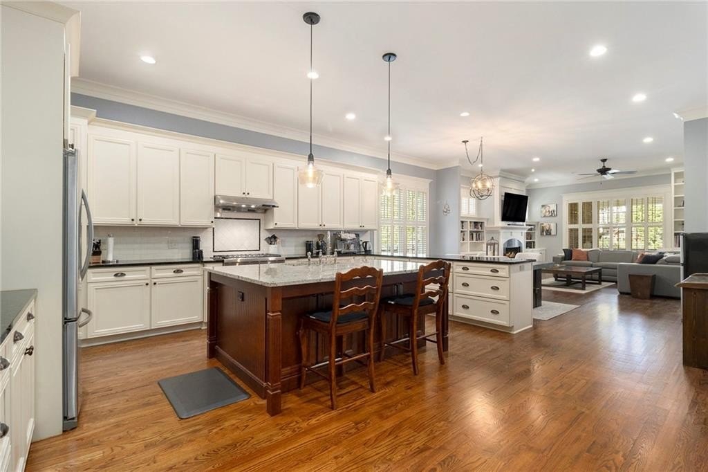 The heart of the home is the breathtaking open-concept kitchen and living area, featuring an oversized island with granite countertops, farmhouse sink, and wraparound custom cabinetry. High-end Thermador gas cooktop and stainless-steel appliances make this a true chef’s kitchen. A butler’s pantry connects to the dining room, and a spacious walk-in pantry with floor-to-ceiling shelving offers exceptional storage.
