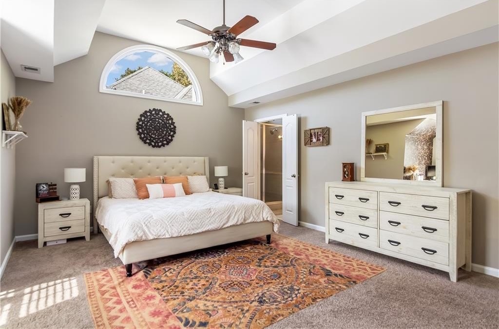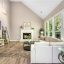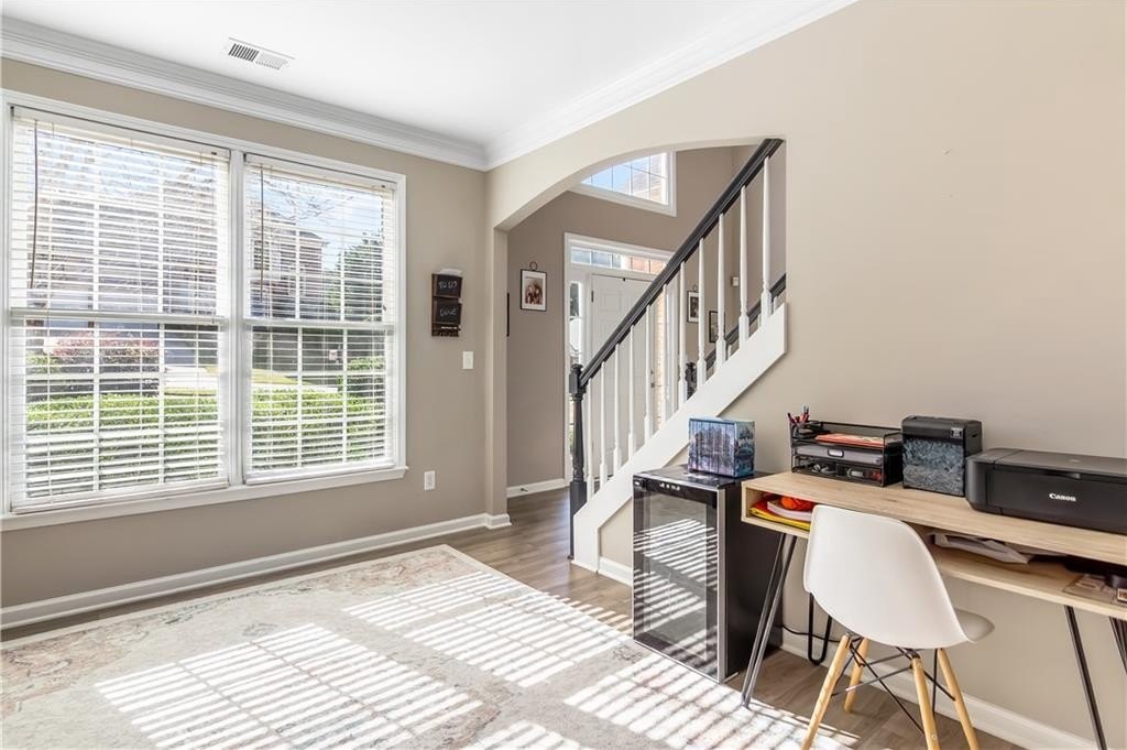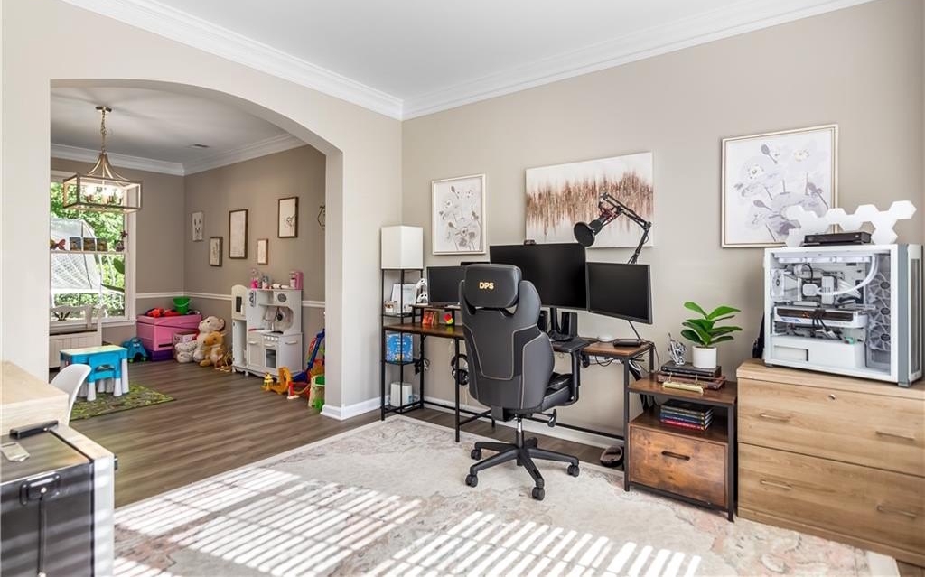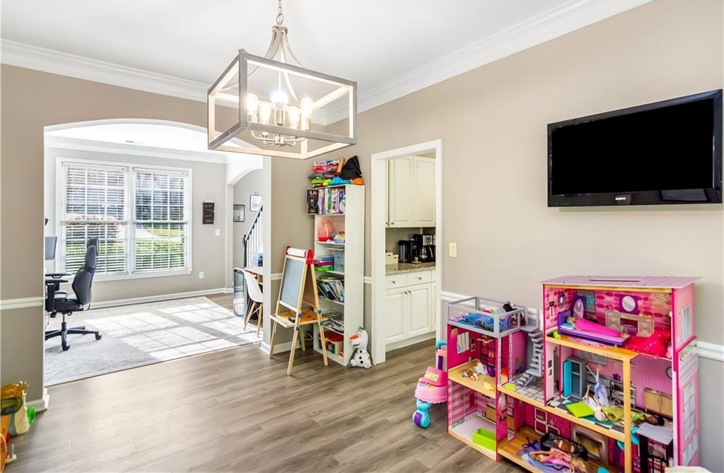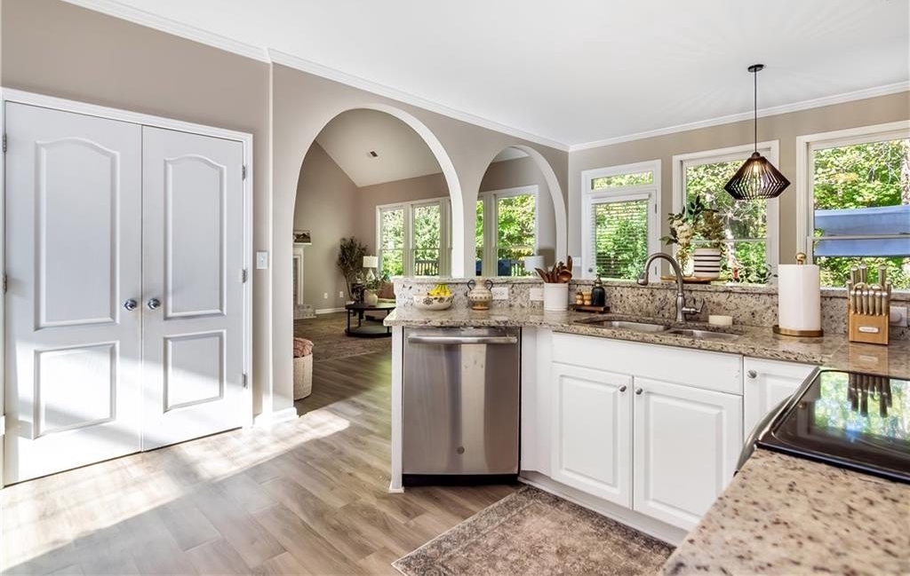 The bright, open kitchen features granite countertops, stainless steel appliances, white cabinetry, and a spacious eat-in area. Elegant arched doorways lead into the inviting family room with a cozy gas fireplace, perfect for gatherings or relaxing evenings at home. The main level also offers a separate dining room and living room, providing plenty of flexible space for entertaining or a home office.