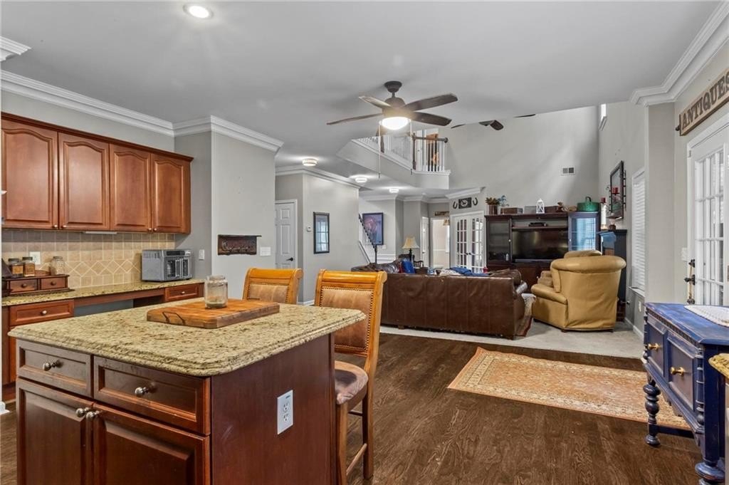 The main level showcases a formal living room with elegant refinished hardwoods and a dining room with trey ceiling, crown molding, and judge's paneling. The well-appointed kitchen offers a planning desk, center island, granite countertops, tile backsplash, and abundant cabinet storage. The impressive two-story family room features a gas starter fireplace and open sightlines to the kitchen, perfect for gatherings.