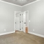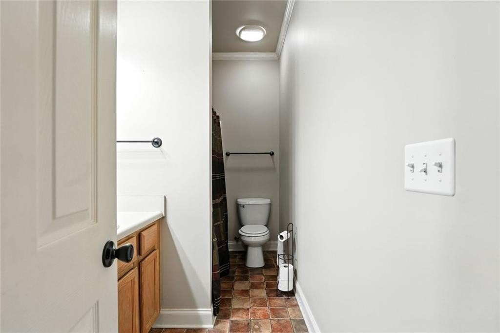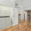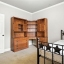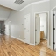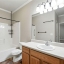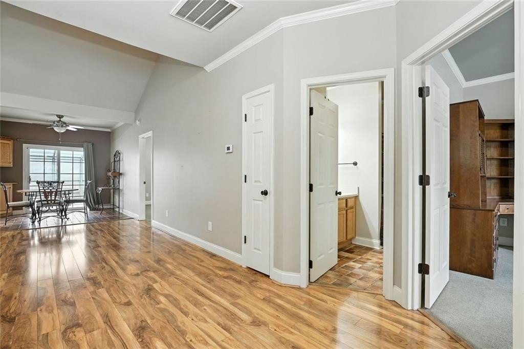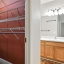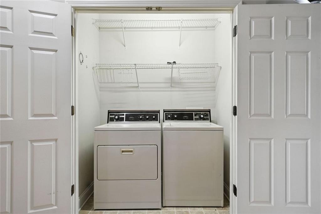 The primary bedroom suite features a walk-in closet with a custom shelving system and a full bathroom equipped with updated lighting and ample vanity space. A second bedroom and full bath provide room for guests or flexible use as an office or den. The laundry area is tucked away behind double doors and includes upper shelving for easy organization.