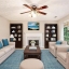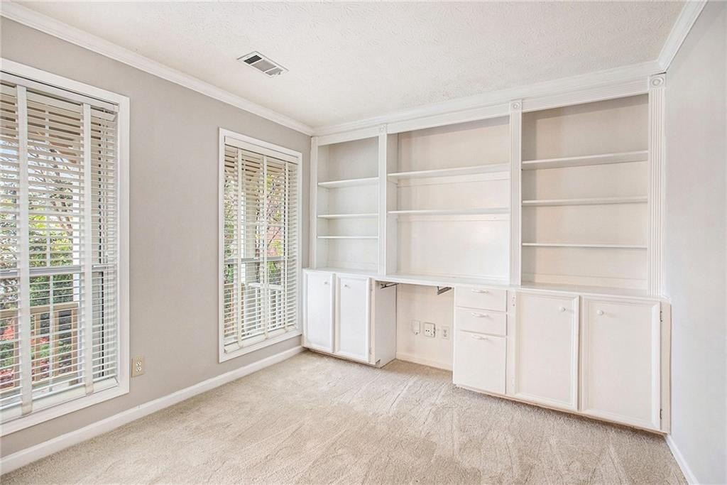 Step into the foyer, where you’ll find a private office with built-in desk and bookshelves to the left—perfect for remote work