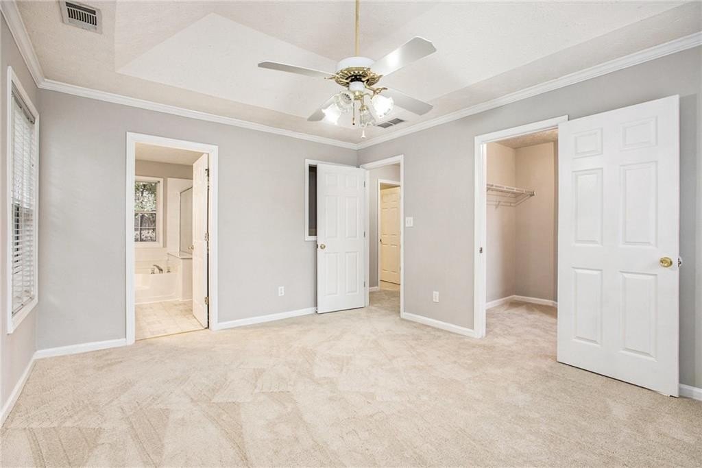 Upstairs, the primary suite is a true retreat with a tray ceiling, large walk-in closet, and a spa-like bath featuring a double