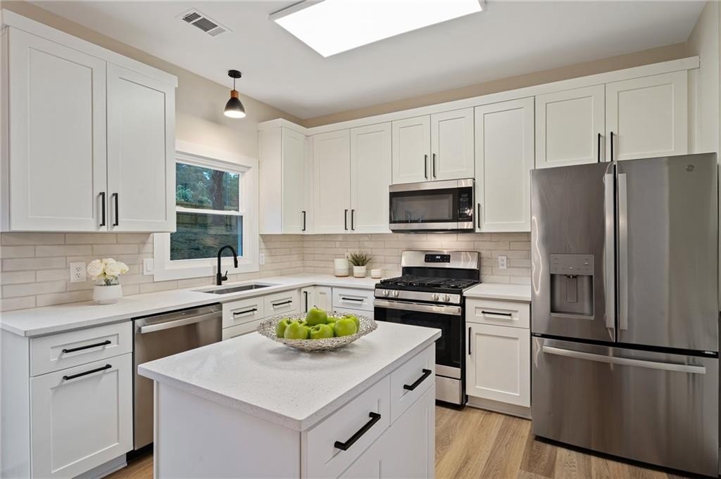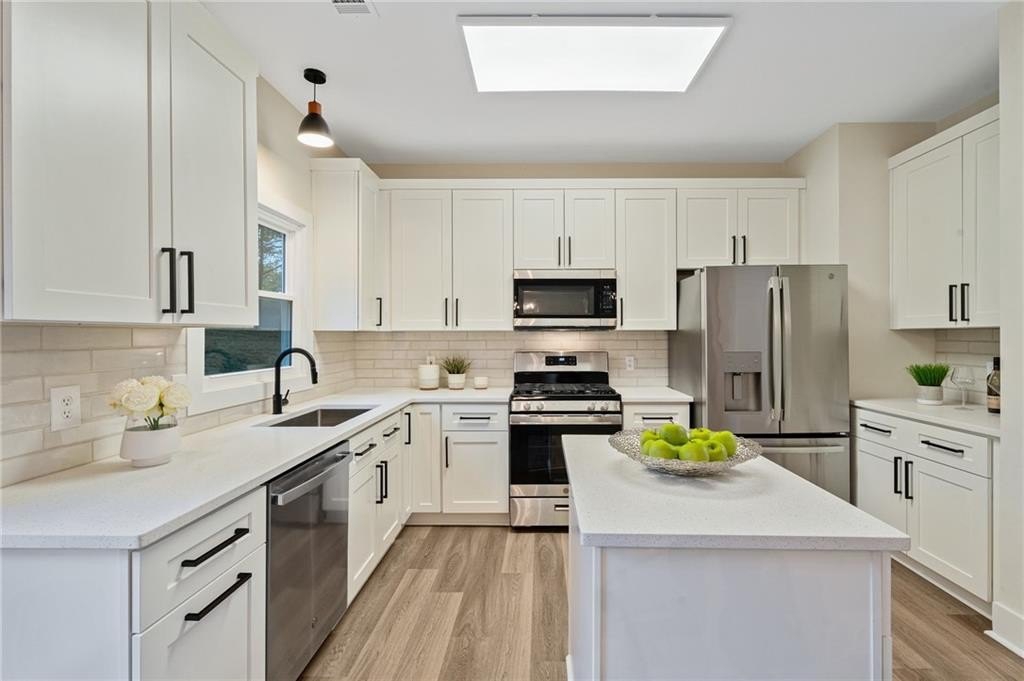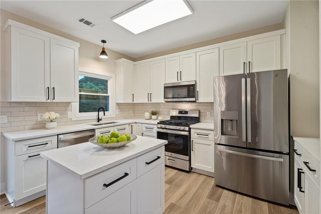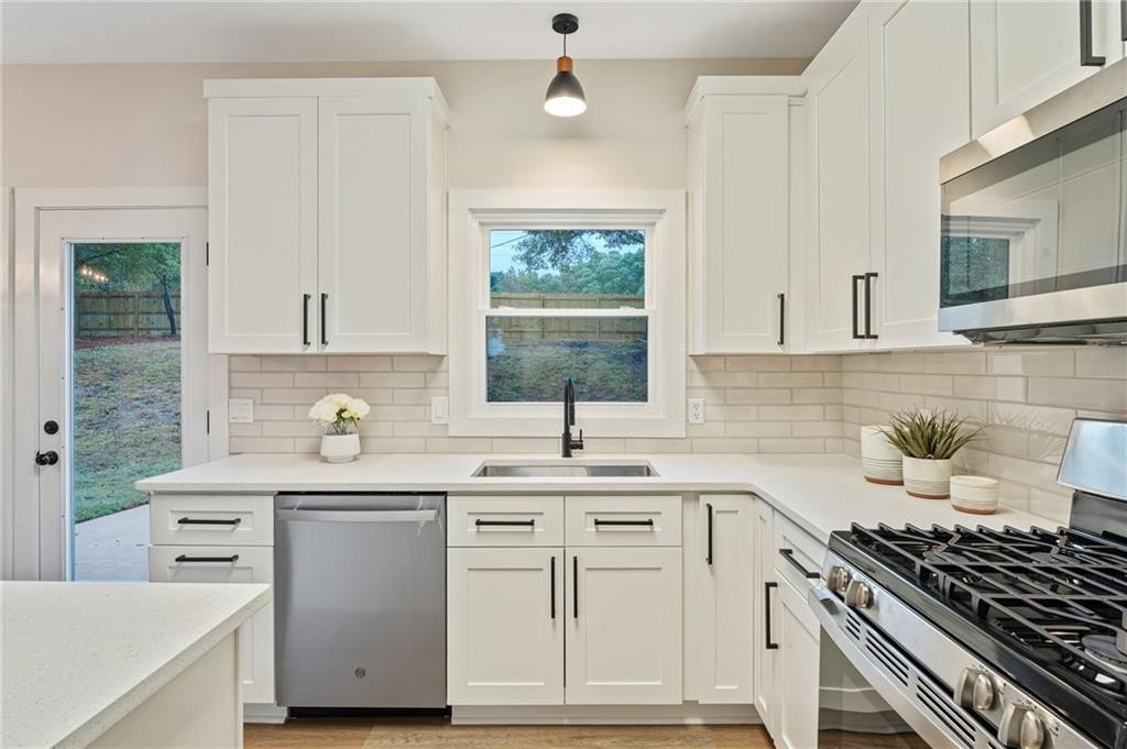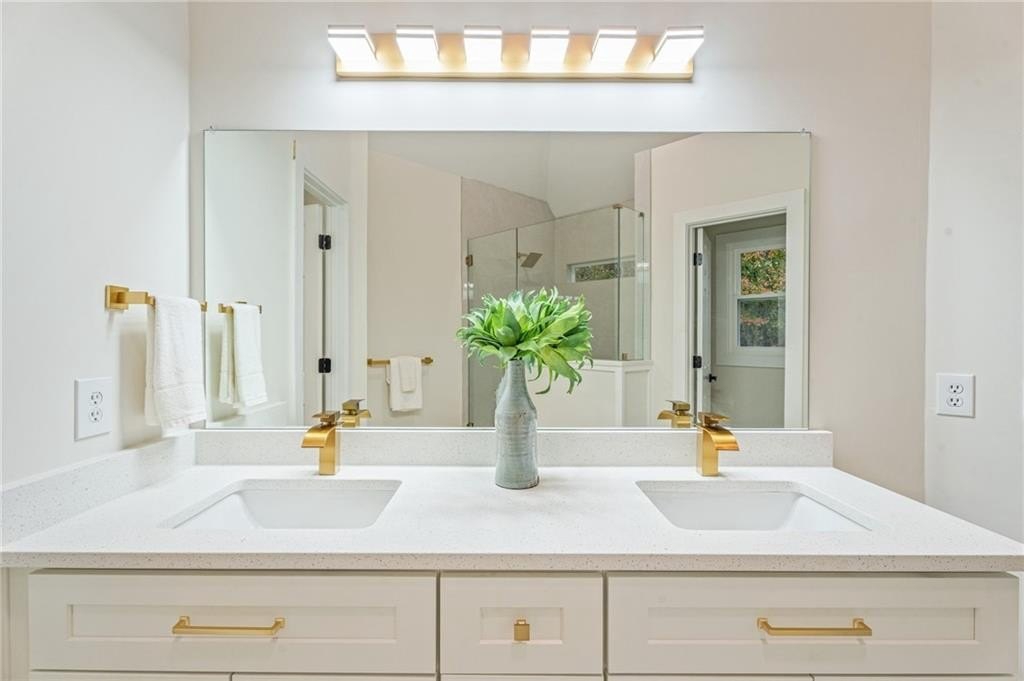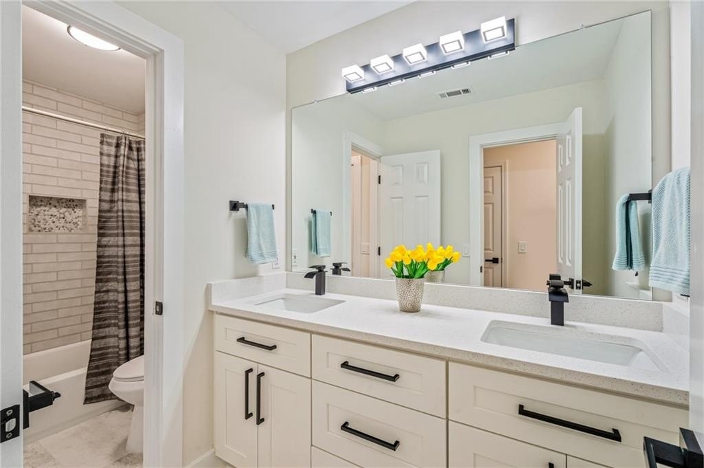 Step inside to discover a bright, open floor plan filled with high-end upgrades and modern finishes throughout. The brand new kitchen is the centerpiece of the home, featuring quartz countertops, stainless steel appliances, and custom cabinetry – perfect for every day living and entertaining. Every bathroom has been beautifully renovated, with a luxurious primary suite, showcasing an oversize custom tile shower that is sure to impress. Additional updates include new flooring and carpeting, modern fixtures and hardware, upgraded lighting and ceiling fans in every bedroom, and custom metal doors entering the office for a designer touch. The home also features new trim-work on the main level, updated stair spindles and door handles, and not one, but two new HVAC systems for year-round comfort and efficiency. The three car garage offers ample space and includes a freshly epoxy-coated floor that makes a statement of its own. Enjoy a peaceful sunset view from your private backyard and a convenient location that's close to top schools, shopping, dining and GA 400 – all well nestled in a quiet established neighborhood.