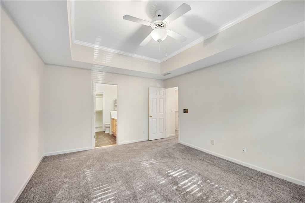 Upstairs, the oversized primary suite features a tray ceiling, dual vanity bath with separate tub and shower, and a walk-in closet with custom organizer system. Two additional bedrooms share a well-appointed bath and provide flexible space for guests, home office, or fitness.