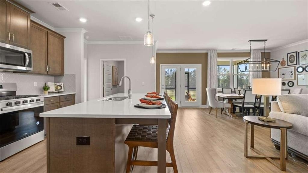 RANCH! Highly sought after Active Adult Community in rural Locust Grove close to Tanger Mall, I75, three golf courses, two major healthcare centers, dining and shopping close by and numerous parks with walking trails. Our amenities include pickleball courts, bocci, dog park, pool and clubhouse. The Clifton plan has "single level living! Get the space you need and the open concept you want. Three bedrooms on the main including a private bedroom suite with spa-like bath and huge closet. Central kitchen with quartz counter tops opens to a spacious family room. there is a covered rear patio plus the bonus flex space upstairs is ideal for a media room or hobby area. Our amenities include pickle ball courts, bocci ball, dog park, clubhouse and pool. Your new home is built with an industry leading suite of smart home products that keep you connected with the people and place you value most. Photos used for illustrative purposes and do not depict actual home.