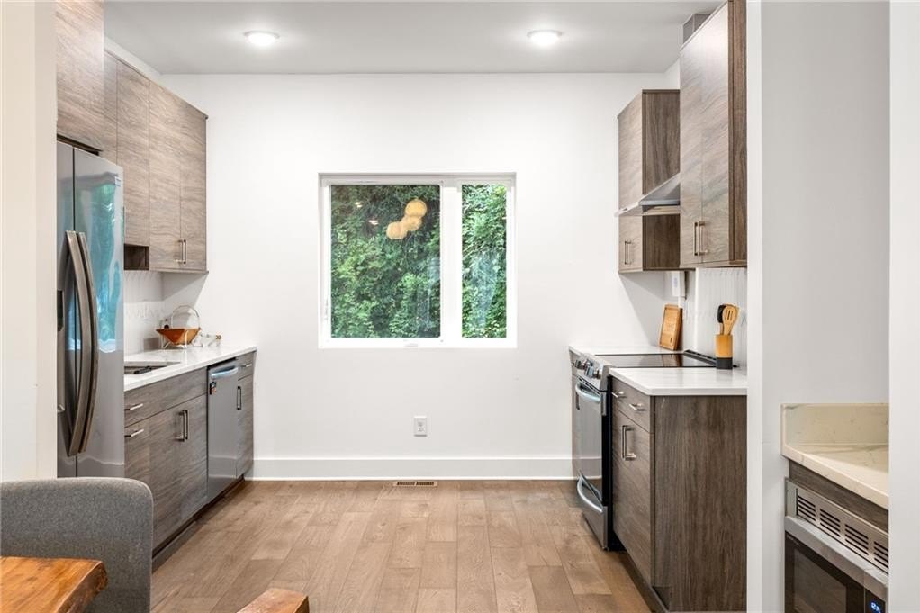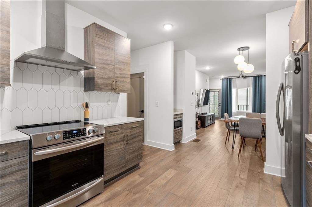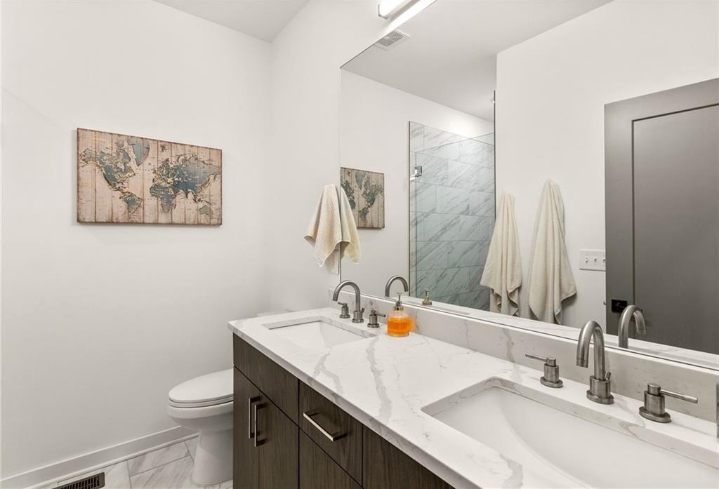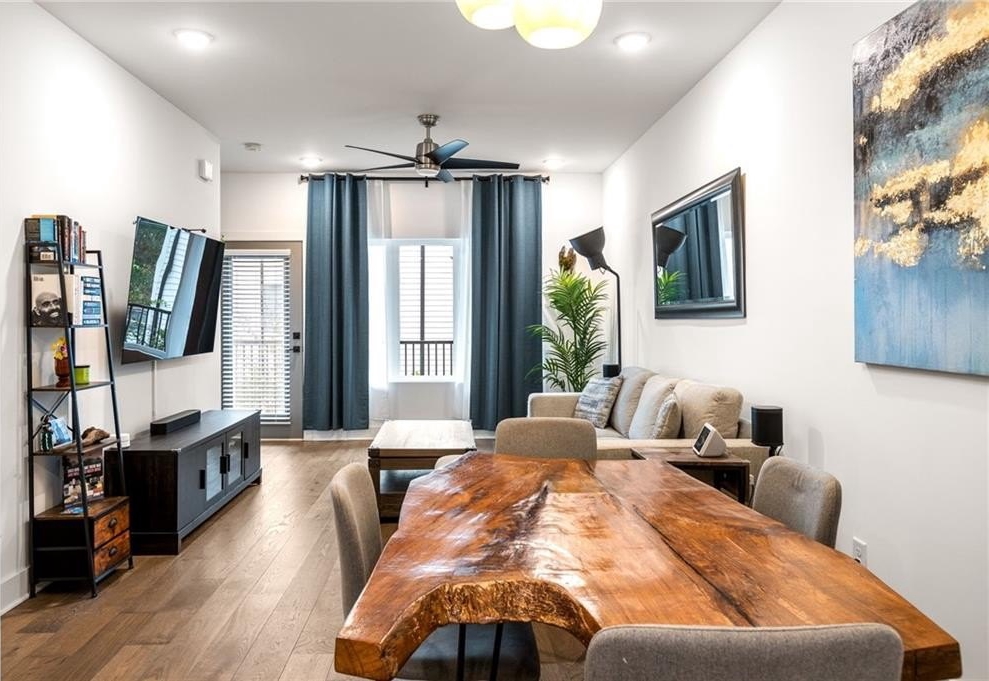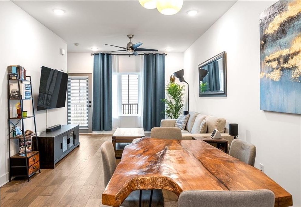 Effortless city living meets resort-style luxury in this Walker Park townhome, designed for the entertainer who loves modern, light-filled spaces. Across three levels, this home combines thoughtful design, high-end finishes, and lifestyle-friendly touches for the ultimate in contemporary comfort. The main level is a seamless blend of style and function, featuring an open-concept living, dining, and kitchen area flooded with natural light. The chef’s kitchen is a true centerpiece, with quartz countertops, a striking tiled backsplash, a five-burner range, convection oven, and stainless-steel appliances. Hardwood floors flow throughout, and the covered balcony off the living room is the perfect perch for morning coffee or evening unwinding. A powder room with bold blue walls and gold accents adds a sophisticated design touch. Upstairs, the primary suite is a private, resort-like retreat with its own balcony, striking accent wall, and en suite bath featuring a frameless glass shower with rain showerhead and double vanity. A second bedroom with a full bath ensures comfort and privacy for guests or family. The lower level includes a versatile bedroom with en suite bath, ideal for a home office, gym, studio, or guest suite. A one-car garage adds privacy and convenience, while high-efficiency appliances, HVAC, and water heater, along with sound insulation throughout, make this home energy and sound efficient. Lifestyle and location converge effortlessly. Just a two-minute walk brings you to Pure Quill Superette and El Tesoro, two of Atlanta’s most celebrated restaurants. Across the street, Walker Park offers a running track, playground, dog park, and expansive field, with Coan Park also nearby. Savor mornings and afternoons on your porch, enhanced with custom shades for sun or privacy. With spaces made for living, entertaining, and enjoying every Atlanta moment, this Walker Park townhome defines modern city luxury.