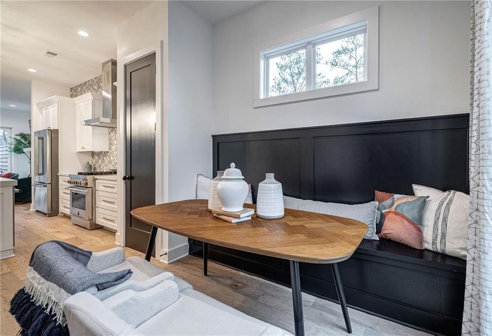 There are no “standard” builder packages in this boutique community of luxury townhomes. While the floor plans of each home are similar, the finishes in each flat have been designer curated so each home is one of a kind. The unique features in this home include: additional square footage in the living room and primary bedroom and additional windows that come with the exclusive "End Unit" status; Natural toned 5" plank hardwood flooring on the main floor & upstairs hallway; 12 ft slider leading to the tree top deck; a cozy gas fireplace finished with a stunning stacked quartz tile & shiplap surround; unique trim features including a light gray accent wall with vertical slat detail in the living room, a built-in banquette in the dining room, a mirrored wall with trim accents that adds light and interest to the staircase, a tongue & groove pine ceiling treatment in the primary bedroom, and a fun trim accent wall in the flex room; and last but not least, a chef's kitchen complemented by a herringbone pattern tile backsplash to the ceiling, white shaker cabinets, gold hardware, white quartz countertops with a laminate edge, and starburst style gold lighting adding an element of fun to the space.