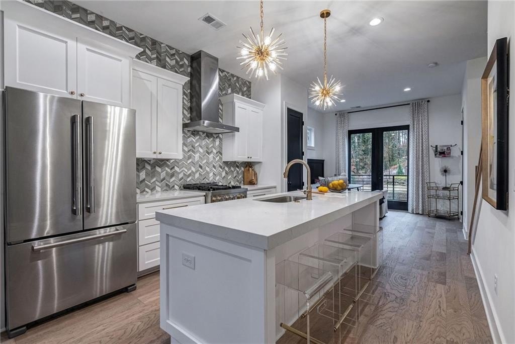 Step inside to a light-filled, open-concept design with wide plank hardwood floors, 10 ft ceilings, and 8 ft doors. The chef-inspired kitchen features shaker-style cabinets, quartz countertops, an oversized island, and state-of-the-art stainless steel JennAir Pro-Style Rise appliances including a gas range and French door refrigerator. Enjoy three outdoor living spaces—a front streetside deck, a 12x16-foot tree-top deck at the rear, and a private terrace patio.