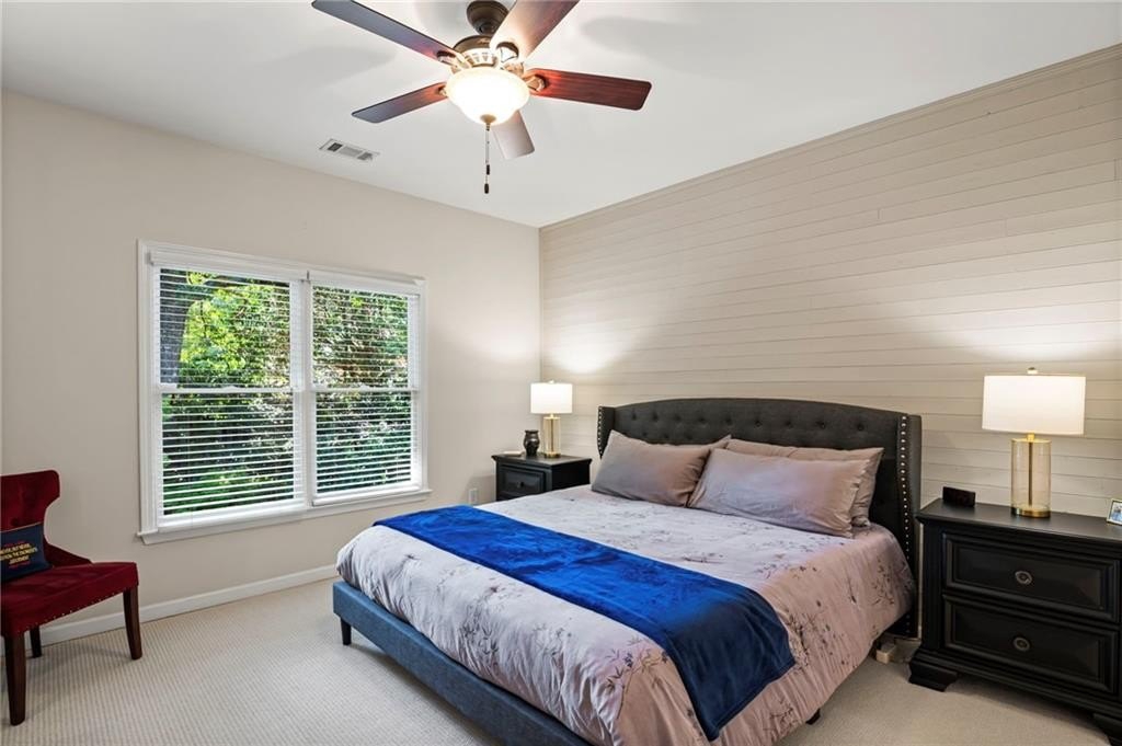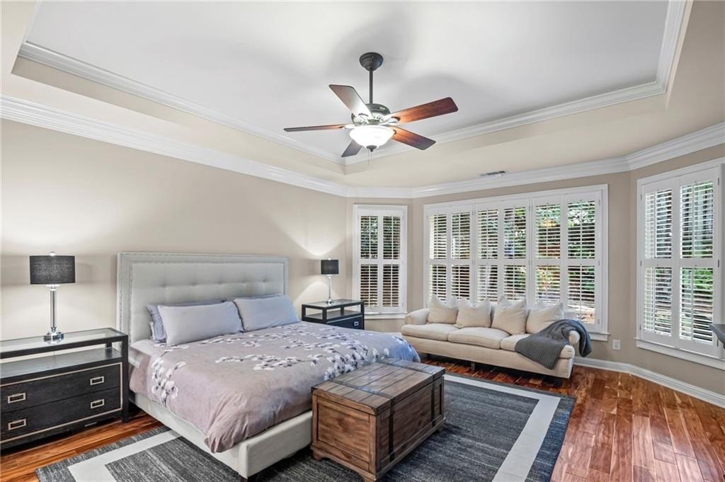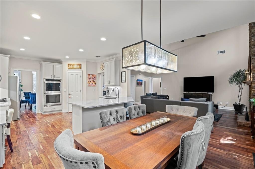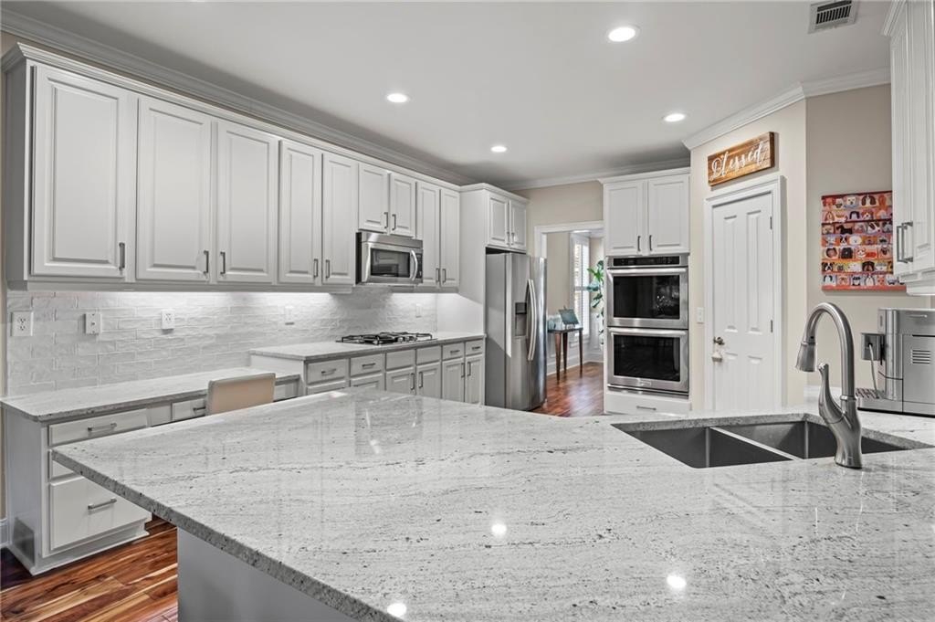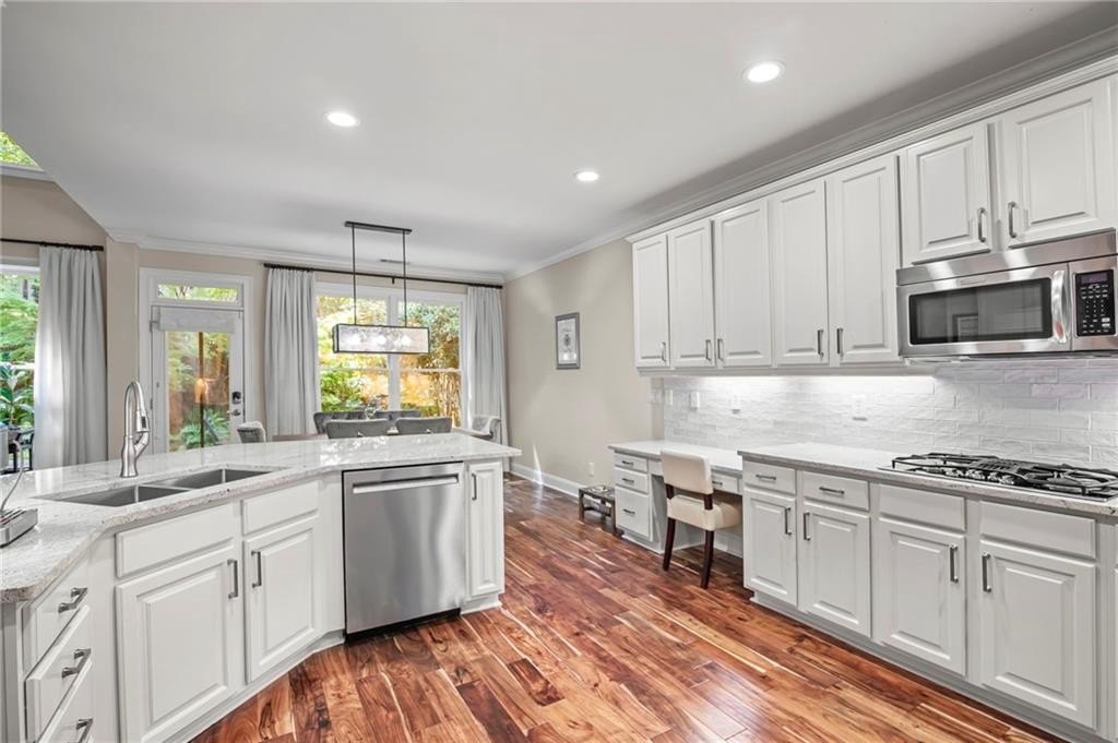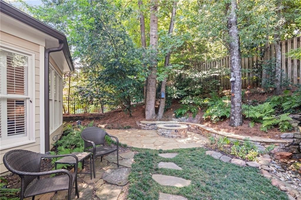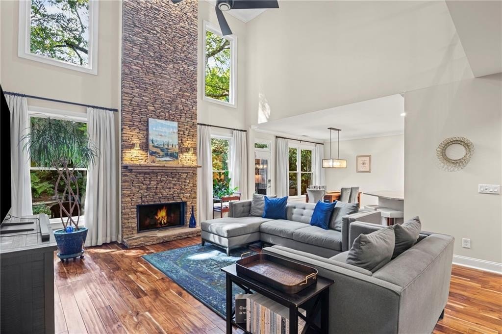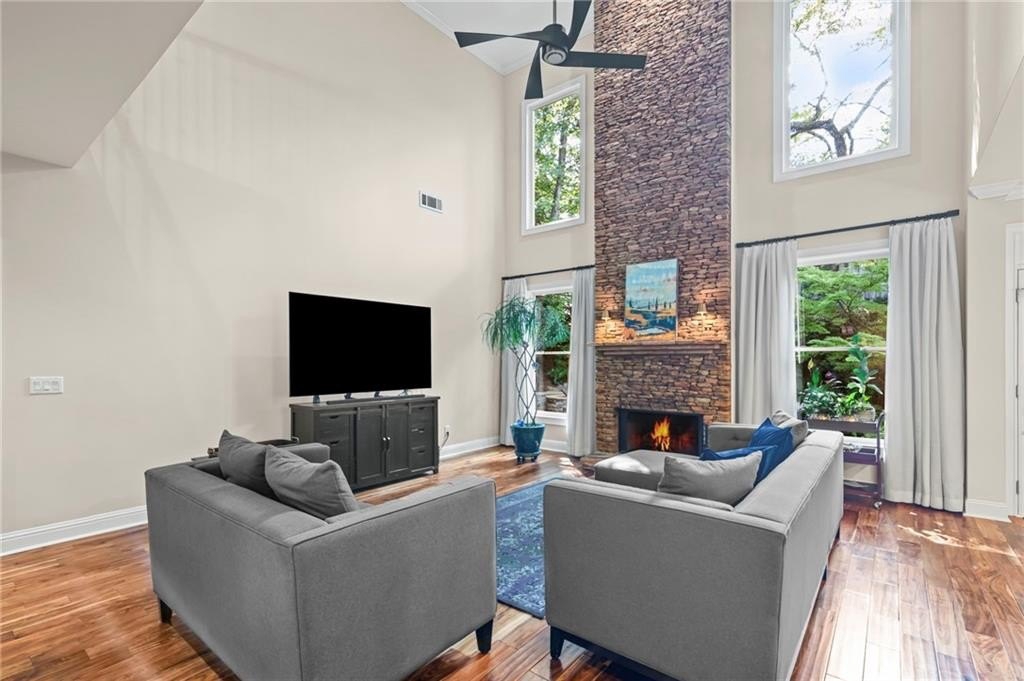 Tucked away on a peaceful cul-de-sac in the coveted Windsor Park community, 3200 Windsor Lake Drive NE is a home that blends timeless style with modern comfort. Built in 2000 and exquisitely maintained, this five-bedroom, four-bath residence offers just over 3,400 square feet of bright, open living space. From the moment you arrive, the home’s warm character and relaxing surroundings invite you in. Step inside and you’ll find gorgeous hand-scraped Asian walnut hardwood floors that flow throughout the main level, setting the tone for the home’s inviting and elegant feel. The updated chef’s kitchen is both stylish and practical, featuring crisp white cabinetry, upgraded premium granite countertops, stainless steel appliances, a walk-in pantry, and a breakfast bar perfect for casual mornings. The kitchen opens seamlessly to the breakfast nook and a two-story great room, where a soaring stacked-stone fireplace creates the perfect centerpiece for family gatherings and cozy evenings. Just off the kitchen, an open dining room provides the ideal space for entertaining or enjoying meals with family in a comfortable, welcoming setting. The open floor plan allows for easy entertaining, flowing from dining room to kitchen to the great room. The spacious owner’s suite on the main level is truly a peaceful retreat, with large windows framing views of the lush green backyard. Its spa-inspired bathroom offers double vanities, a whirlpool tub, glass-enclosed shower, and a spacious walk-in closet with custom cabinetry. Also on the main floor, a vaulted office with grand windows doubles as a guest suite with access to a full bath. Upstairs, you’ll find three large additional bedrooms, two full baths, and a versatile bonus room ready to serve as a playroom, media lounge, or home office. Outdoors, this home features a stunning backyard. A walkout stone patio extends the living space to a beautiful private garden, perfect for entertaining or quiet relaxation. The gorgeous landscaped yard features mature plantings, a custom fire pit with curved built-in stone seating, and even a gentle waterfall feature, creating an oasis-like atmosphere right at home.