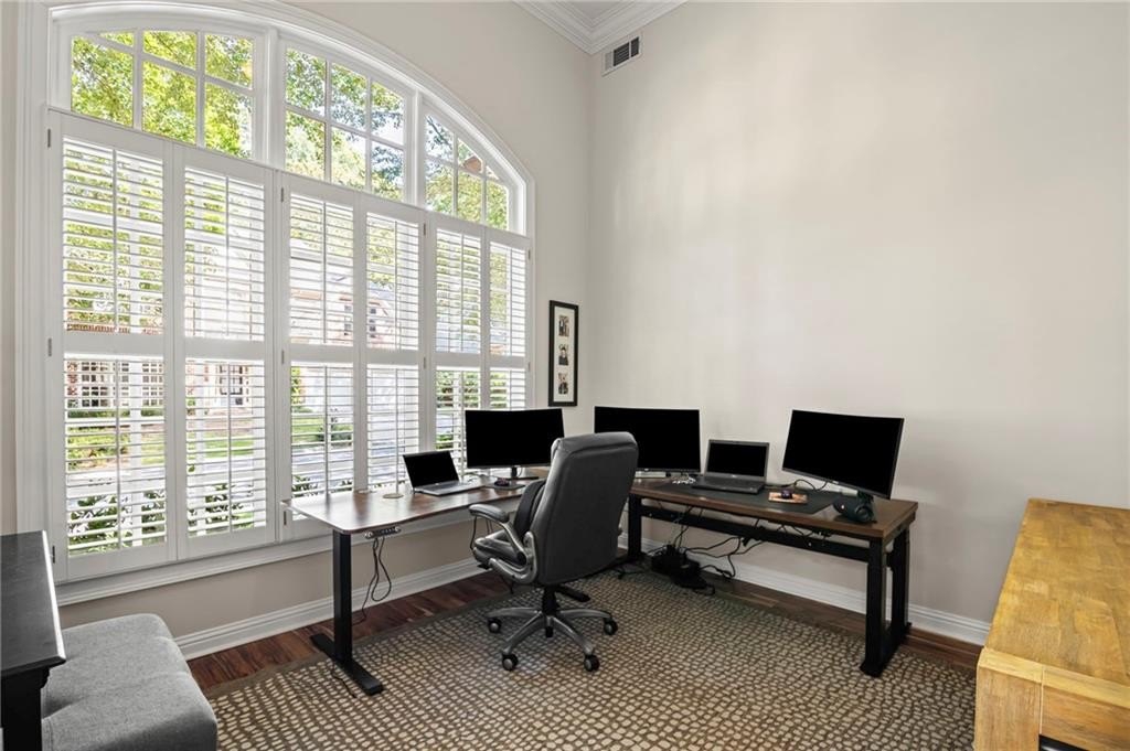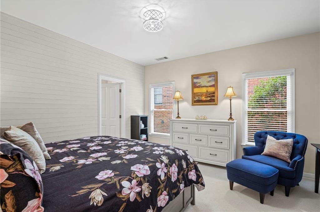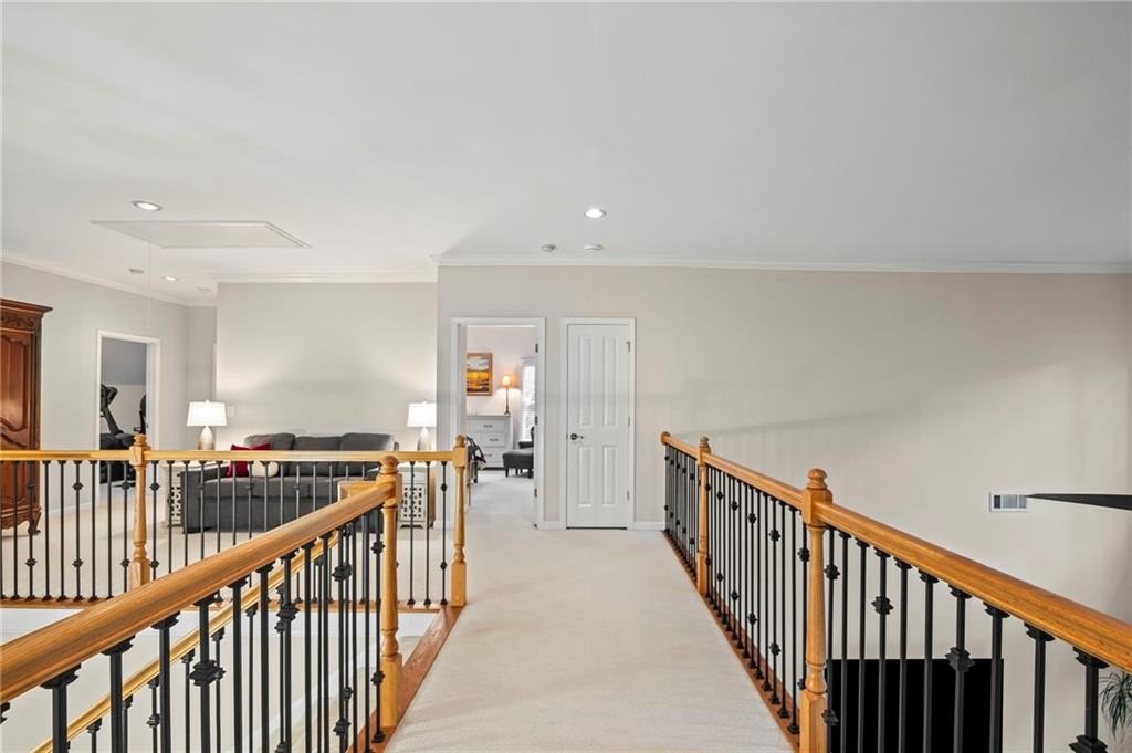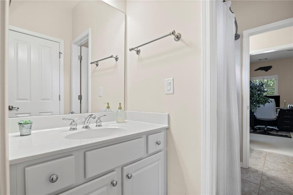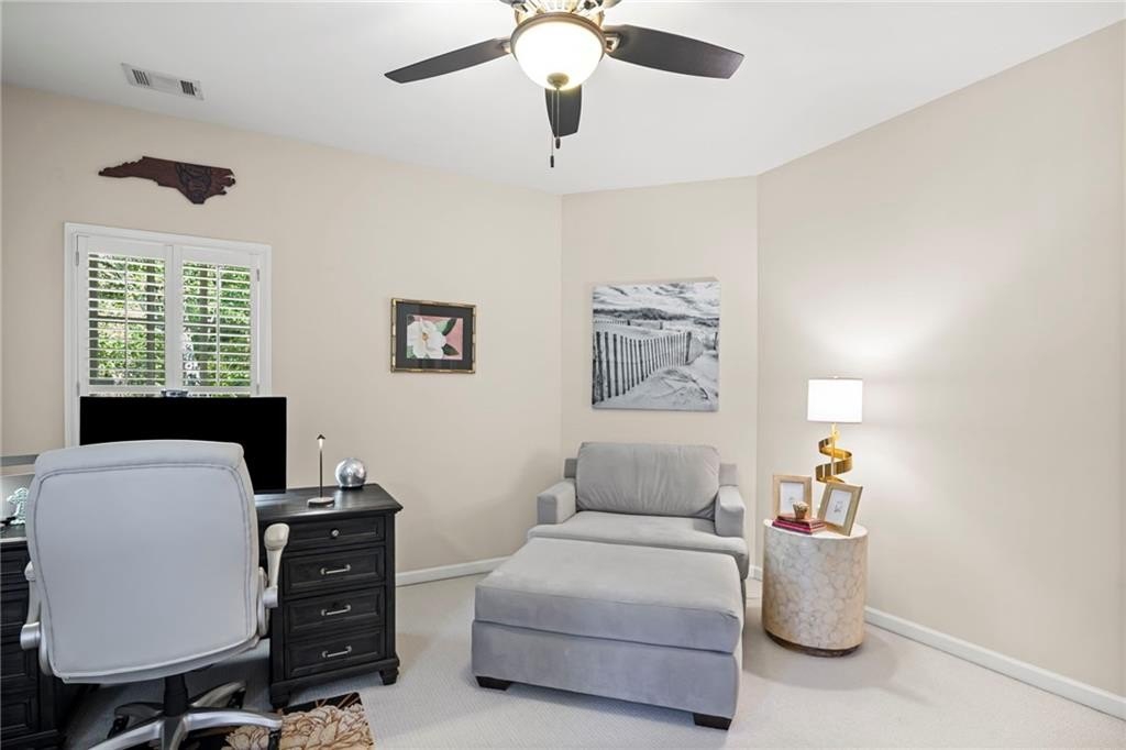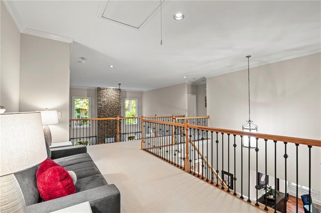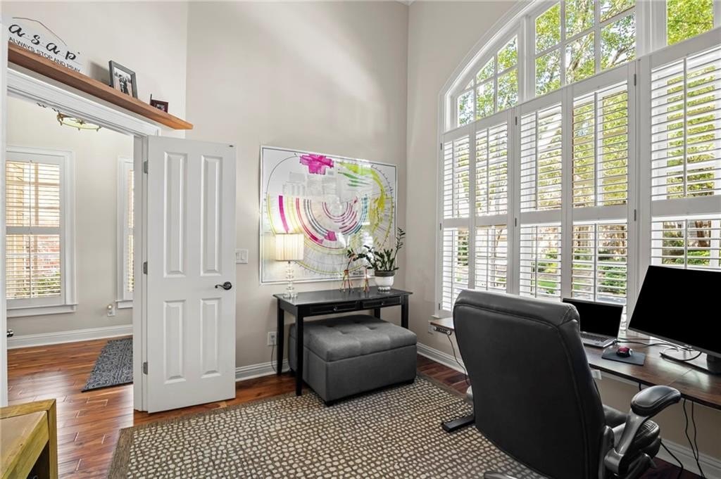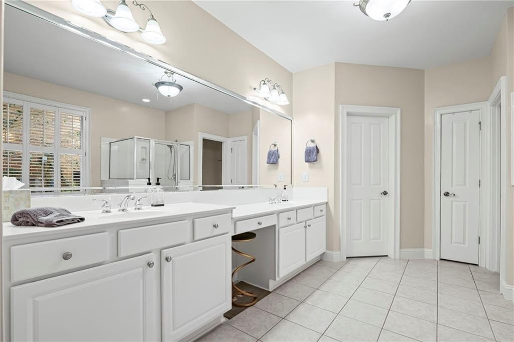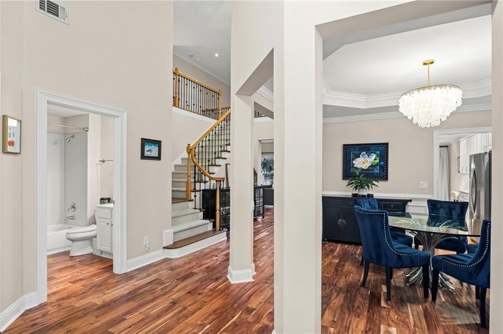 Tucked away on a peaceful cul-de-sac in the coveted Windsor Park community, 3200 Windsor Lake Drive NE is a home that blends timeless style with modern comfort. Built in 2000 and exquisitely maintained, this five-bedroom, four-bath residence offers just over 3,400 square feet of bright, open living space. From the moment you arrive, the home’s warm character and relaxing surroundings invite you in. Step inside and you’ll find gorgeous hand-scraped Asian walnut hardwood floors that flow throughout the main level, setting the tone for the home’s inviting and elegant feel. The updated chef’s kitchen is both stylish and practical, featuring crisp white cabinetry, upgraded premium granite countertops, stainless steel appliances, a walk-in pantry, and a breakfast bar perfect for casual mornings. The kitchen opens seamlessly to the breakfast nook and a two-story great room, where a soaring stacked-stone fireplace creates the perfect centerpiece for family gatherings and cozy evenings. Just off the kitchen, an open dining room provides the ideal space for entertaining or enjoying meals with family in a comfortable, welcoming setting. The open floor plan allows for easy entertaining, flowing from dining room to kitchen to the great room. The spacious owner’s suite on the main level is truly a peaceful retreat, with large windows framing views of the lush green backyard. Its spa-inspired bathroom offers double vanities, a whirlpool tub, glass-enclosed shower, and a spacious walk-in closet with custom cabinetry. Also on the main floor, a vaulted office with grand windows doubles as a guest suite with access to a full bath. Upstairs, you’ll find three large additional bedrooms, two full baths, and a versatile bonus room ready to serve as a playroom, media lounge, or home office. Outdoors, this home features a stunning backyard. A walkout stone patio extends the living space to a beautiful private garden, perfect for entertaining or quiet relaxation. The gorgeous landscaped yard features mature plantings, a custom fire pit with curved built-in stone seating, and even a gentle waterfall feature, creating an oasis-like atmosphere right at home.
