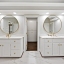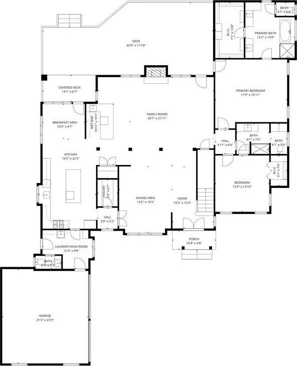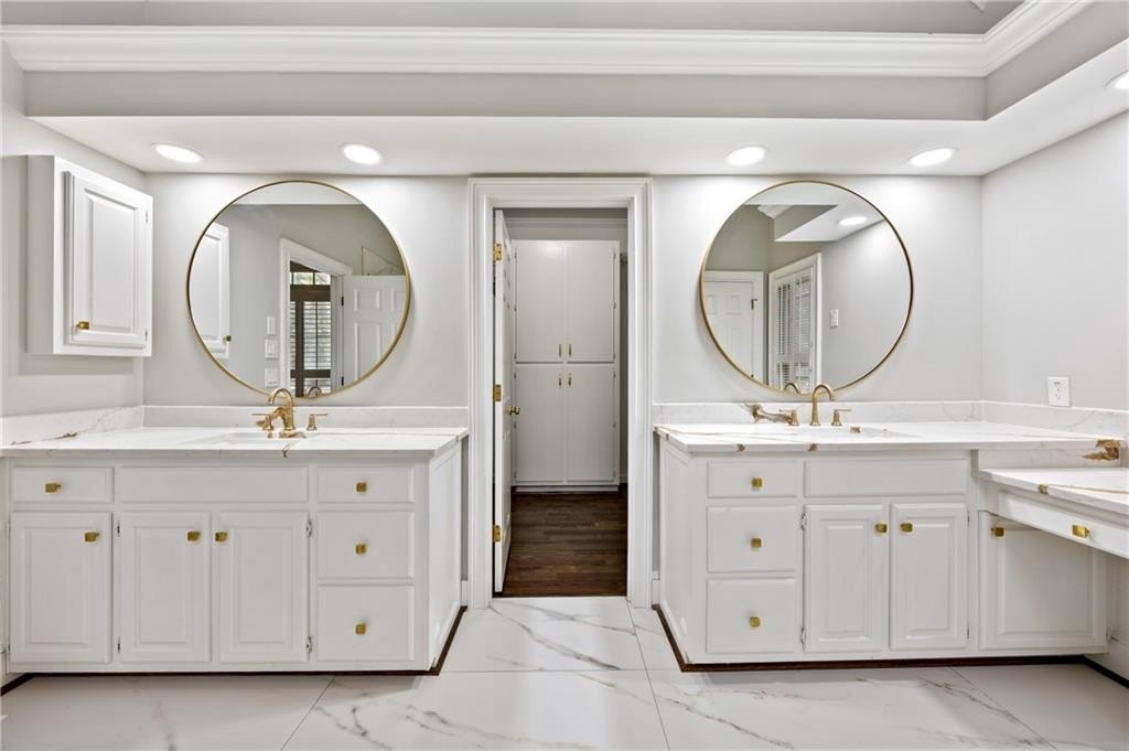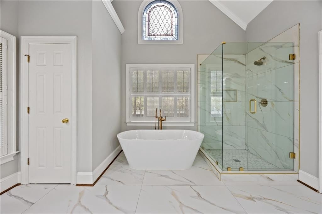 A spacious laundry room with mud sink and powder room sit just off the kitchen for added convenience. The primary suite on the main level is a true retreat, complete with a walk-in closet and a fully renovated spa-inspired bath featuring a soaking tub, separate shower, and double vanities with marble countertops. An additional bedroom and full bath on the main level provide ideal space for guests or an office.